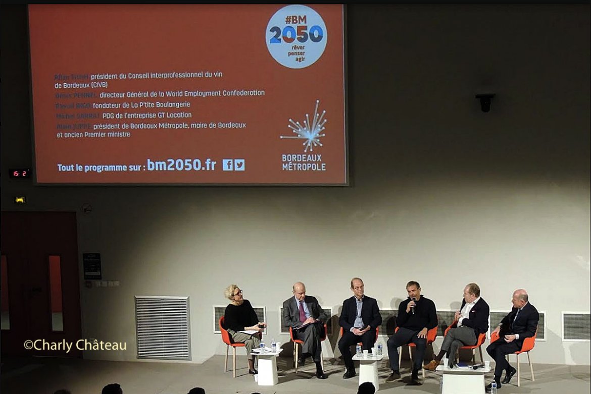 Anne-Catherine Guitard le rappelait lors de sa présentation de cette conférence portant sur le thème de l’emploi et du travail, il était important d’inscrire KEDGE dans l’initiative #BM2050. Parrain de la promotion 1998 de la business school bordelaise, Alain Juppé tenait une fois de plus à mettre en avant ce projet participatif qui connaît beaucoup de mobilisations et beaucoup de succès. Succès notamment lors des précédentes conférences organisées dans la métropole qui ont rassemblées de nombreux girondins et girondines. Ces allocutions sont suivies aussi bien par les étudiants que par les pères et mères de famille ainsi que les seniors. Si ce projet #BM2050 fonctionne aussi bien c’est parce que les citoyens bordelais se sentent véritablement concernés et écoutés. Cet aspect de collaboration participative apportée aux habitants de la métropole est essentiel. Ainsi, pendant plus de deux heures Alain Juppé et ses compagnons du soir ont exposé l’idée qu’ils se font du travail en tentant d’envisager les futures mutations des mondes professionnels dans les prochaines décennies. L’ancien premier ministre et désormais l’ancien maire de Bordeaux était accompagné d’Allan Sichel, président du Conseil interprofessionnel du vin de Bordeaux (CIVB), de Dennis Pennel, directeur général de la World Employment Confederation, de Pascal Rigo fondateur de La P’tite Boulangerie mais également du PDG de l’entreprise GT Location, Michel Sarrat.