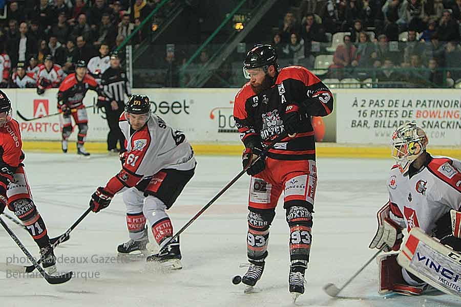 C’était le dernier match de l’année et il a eu lieu sur la glace de Mériadeck devant plus de 3.300 spectateurs venus soutenir leur équipe que ce soit les Boxers ou Amiens qui avait fait suivre une poignée de fidèles. Avec cette victoire non seulement les Boxers dépassent les Gothiques d’Amiens mais reviennent à égalité de points avec les Lions de Lyon qui seront leur adversaire pour la demi-finale de la Coupe de France le mardi 9 janvier sur la glace de Mériadeck, rappelons pour mémoire que Lyon est venu s’imposer avant la trêve par un petit 6 à 5 sur la glace locale. Période qui a correrspondu à une baisse de régime mais avec l’arrivée de Qemeneur, les choses ont changé. Il faut dire en passant qu’il vient durant cette soirée d’encaisser un but devant son public qui ne lui en a nullement tenu rigueur car à côté il a été décisif. Le premier match de l’année aura lieu aussi à la patinoire Mériadeck où les Boxers recevront Mulhouse pour un troisième match à domicile. Le trésorier se frotte les mains car avec plus de 3.000 spectateurs les caisses se remplissent.