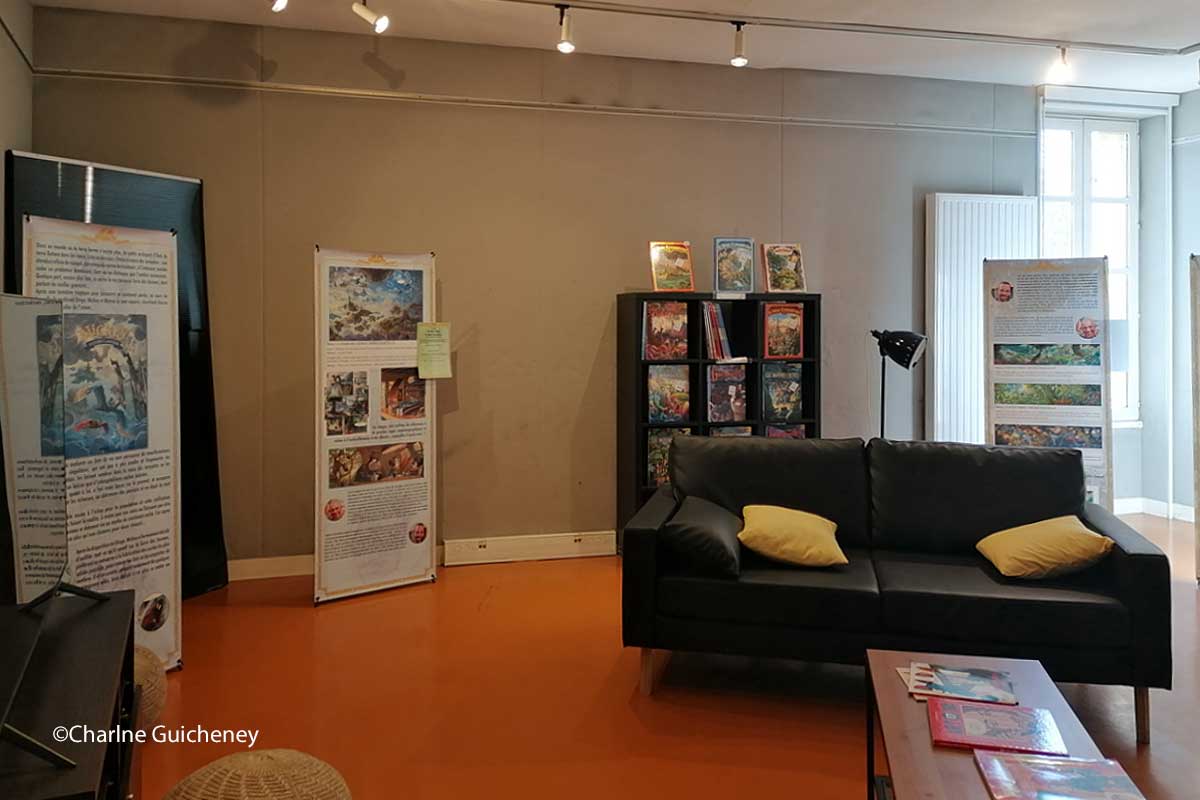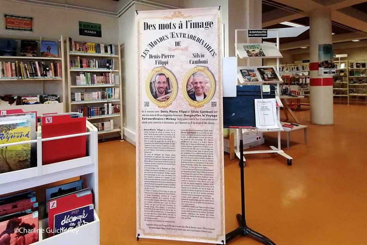 Dans une pièce consacrée à l’exposition, étrangement familière à un salon, vous avez la possibilité de vous poser dans les canapés pour profiter des somptueux paysages et histoires farfelues que racontent Denis-Pierre Filippi et Silvio Cambani dans Les Gargouilles (série en 7 volumes), Les Mondes cachés (série en 4 volumes) et Un voyage extraordinaire. En 2012, il publie le premier tome de Le Voyage extraordinaire chez Vents d’Ouest, et en 2015 paraît la série Les Mondes cachés chez Les Humanoïdes Associés, une aventure indépendante dont le héros est le jeune Grégoire de Gargouilles, devenu mage. Filippi excelle dans les scénarios où une pointe d’imaginaire vient enchanter le récit.