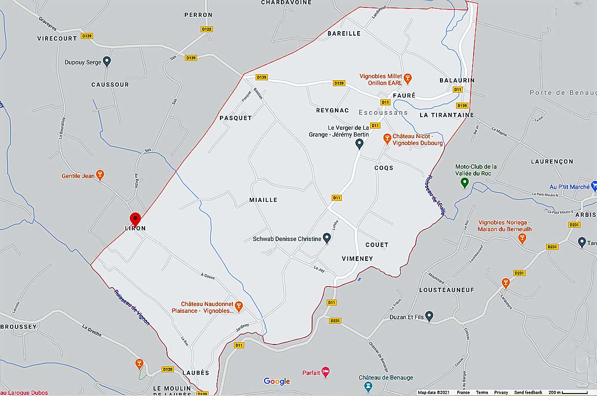 - Escoussans et le site de Liron en rouge