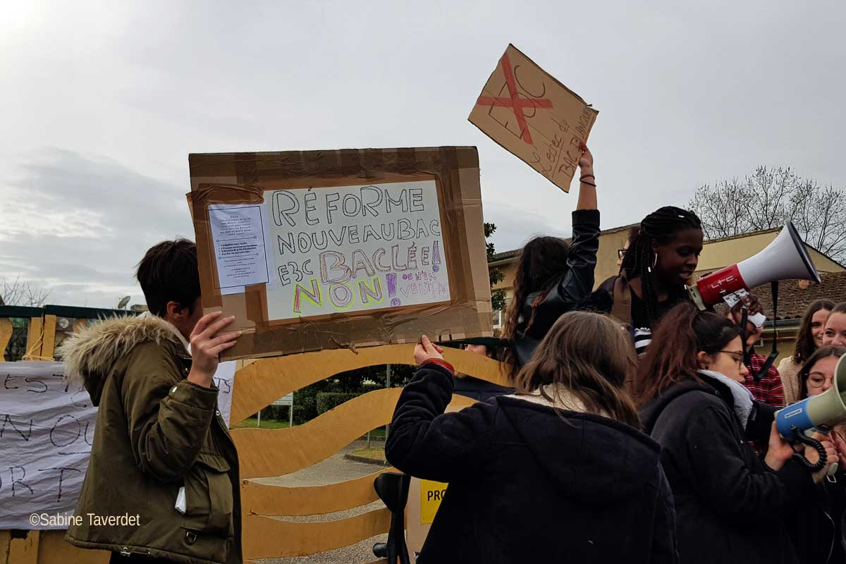 Autre décor au lycée Jean Moulin de Langon jeudi matin. Dès 6h du matin, les lycéens faisaient le pied de grue devant l’établissement soutenus par quelques représentants de parents d’élèves et des gilets jaunes auxquels ils avaient fait appel. Ici, la réforme du baccalauréat et la pilule estampillée « E3C » ont du mal à passer. La répartition de la note finale du bac est un véritable casse-tête pour élèves et parents : si les épreuves finales en terminale représentent 60% de la note, comprenant les épreuves anticipées de français en première, les 40% du contrôle continu reste flous. Ce dernier se divise en 10% du bulletin scolaire et 30% d’épreuves communes : histoire géo, langue vivante 1 et 2, enseignement scientifique, spécialité et sport, comptant pour chacune coefficient 5. A 14h, les premières doivent passer une épreuve anticipée d’histoire. Outre le problème de compréhension, c’est contre un temps de préparation moindre, la différenciation des cours entre les enseignants et la correction par les professeurs du lycée que les élèves ne digèrent pas. « On ne nous a pas demandé notre avis. Les premières épreuves sont passées seulement quatre mois après la rentrée et on n’a pas tous eu les mêmes cours ! » A midi, le directeur d’établissement vient prendre la température. « Il est vrai qu’il y a beaucoup de changements et qu’ils vont vite. Pour les enseignants, il est aussi compliqué de mettre en place une réforme et les inquiétudes sont légitimes. Il est difficile de rassurer les profs qui ont une charge de travail énorme, c’est une réalité qu’on ne peut pas édulcorer. Cependant, tout le monde appelle à une réforme de l’examen car c’est une machine énorme et coûteuse et qu’elle a une part d’aléatoire. Avant, on jugeait sur une épreuve finale. La réforme en cours tente d’apporter une réponse mais la difficulté est sa mise en place et les personnels auraient aimé avoir plus de temps d’adaptation. Aujourd’hui, d’un point de vue logistique, nous sommes en mesure de la mettre en place. » Si certains établissements en avance sur le calendrier des épreuves avaient déjà été sujets à des blocages, le proviseur n’avait aucune idée de la forme qu’allait prendre la contestation. « C’est normal car nous sommes en démocratie mais je suis affecté que les lycéens soient inquiets et en situation de stress. Pas seulement avec la réforme mais on leur dit que les études sont compromises, que leur planète est foutue… Mon travail est de les préparer et de les sécuriser ».