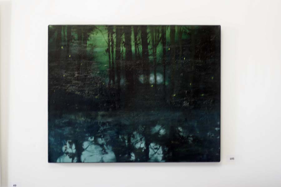 Guillaume Toumanian, marseillais devenu bordelais d’adoption, a choisi une peinture (n°105) « Lucioles III », univers incertain entre chien et loup, entre clair-obscur, entre déjà-vu et imaginé, peinte à l’huile dans des tons bleu, verts sombres voir noir. Cette peinture inspirée de photos prises en roulant montre le mouvement de la vie, les doutes, l’insécurité et que nous sommes peut-être toujours sur le fil du rasoir entre le renoncement (côté sombre) et la combattivité (côté lumineux).