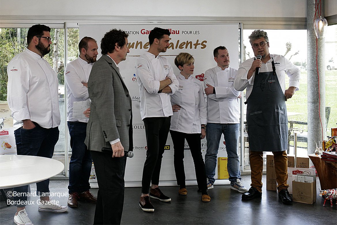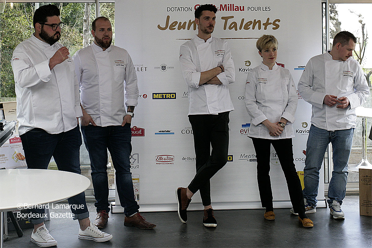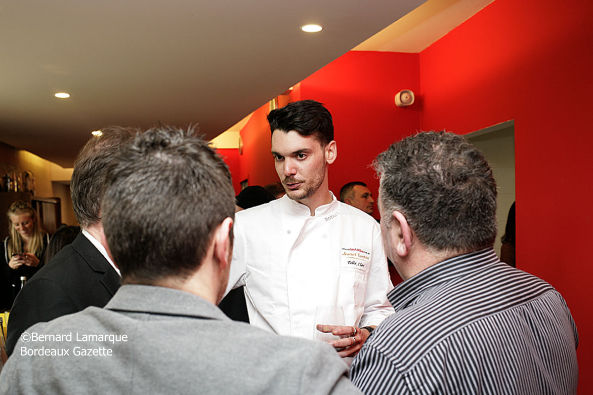 Vivien Durand a voulu rappeler qu’il y a cinq ans le 10 mars, il avait succédé à Jean-Marie Amat aux fourneaux du Prince Noir et il a posé pour la photo avec les jeunes talents lauréats pour cette saison 6 en Aquitaine. Ainsi après cinq saisons passées à dénicher des jeunes talents de la cuisine française et de les aider dans leurs projets l’objectif étant toujours le même, celui d’aider plus que jamais des chefs de cuisine à devenir des chefs d’entreprise Gault et Millau a sélectionné trois lauréats. En fait ils sont cinq car il n’y en a qu’un qui travaille seul et c’est l’hyper local de l’étape car son projet est bordelais. Les autres sont associés pour mener à bien leur projet. Les trois lauréats reçoivent une dotation en produits et en matériel qui représente près de 10% de l’investissement du chef. Cette année, douze nouveaux jeunes chefs de cuisine seront ainsi récompensés en France avec cette dotation. En fait se sont cette sélection est effectuée par des chefs à quatre ou cinq toques appelés les 80 magnifiques qui sont les mieux placés pour repérer les futurs grands noms les ayant souvent vu travailler dans leur environnement.