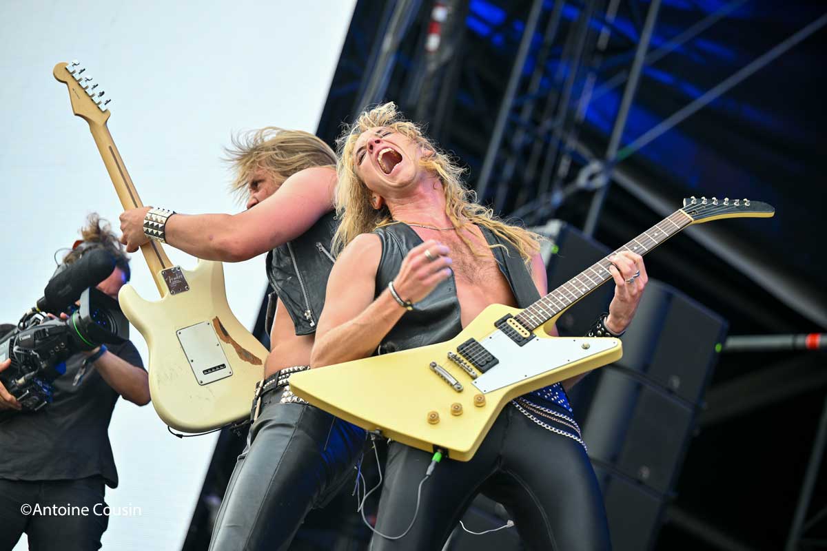 Comme tout un symbole, le premier éclair et le tonnerre retentirent lors de la première note du concert de Thundermother . Les 4 jeunes femmes de ce groupe de rock suédois ne se sont pas laissées abattre et ont réalisé un concert de 30 minutes de très grande qualité. Elles ont presque fait oublier ce temps apocalyptique, cette pluie diluvienne qui transperça jusqu’à la moelle un public diminué mais quand même resté en nombre devant la valeur de ces quatre musiciennes et de leurs capacités à faire le show.
