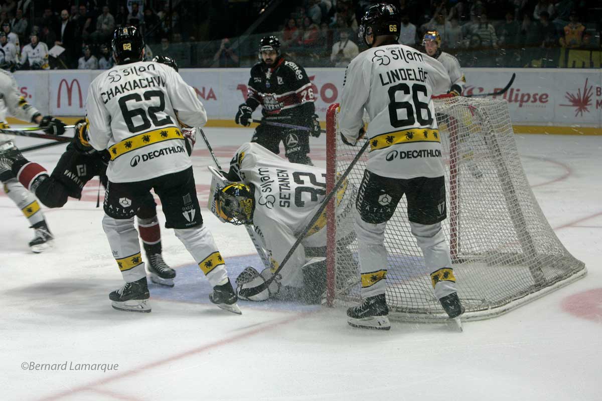Mais Bordeaux à la maison est sur une autre planète. Et comme souvent, c’est Kévin Spinozzi qui va libérer les rouges et noirs, sur une magnifique frappe à distance qui passe entre les jambes du goal des Dragons. Spino’ envoie donc son 11ᵉ palet de l’année au fond des filets adverses et permet aux Boxers de prendre l’avantage. Malgré ça, les pertes de palets bordelaises continuent de saper le jeu girondin et Rouen reste dans la rencontre en mettant une pression toujours plus forte sur la défense de Bordeaux. Une pression qui finira par faire craquer l’équipe dirigée par Olivier Dimet. En infériorité après une sanction douteuse sur Maxim Lamarche, les Bordelais ne peuvent défendre face à la déferlante Rouennaise, en supériorité numérique. Alexander Lindelôf trompe Papillon avec une frappe splendide qui traverse la moitié de terrain bordelaise. Les deux équipes se retrouvent à égalité, et Bordeaux ira même jusqu’à défendre à trois contre cinq après deux pénalités pour Julius Valtonen et Kévin Dusseau, à seulement 40 secondes d’écart. Le remake de la finale 2023-2024 part donc en prolongations, où aucune des deux formations n’arrive à prendre vraiment l’avantage sur l’autre. Les Dragons font craquer les Boxers en prolongations, après trois penaltys transformés par Anthony Rech, définitivement le joueur offensif de ce début d’année dans cette ligue Magnus, lors d’une séance lors de laquelle Oskari Setanen gagne son duel à distance face à Quentin Papillon avec quatre stops contre 3 pour le goal bordelais.
