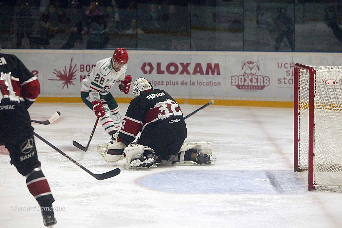 Car une des raisons de l’inefficacité offensive des deux premiers tiers-temps se trouve dans les nombreuses absences côté Boxers. Mathieu Pompéi, Kévin Spinozzi ou encore Julien Guillaume manquent à l’appel et les Bordelais le ressentent. Le malheur se continue quelques instants avant la fin du deuxième tiers-temps, avec un but magnifique de Craig Puffer, qui dribble facilement Quentin Papillon (25 arrêts). Les Boxers se retrouvent à deux buts derrière, et les espoirs de résultats s’amoindrissent au fil des minutes. Mais c’était avant la révolte. Deux actions lors du troisième tiers-temps, deux fois sur supériorité numérique, où Baptiste Bruche inscrit son troisième doublé de la saison, la deuxième face aux rivaux d’Anglet. L’international français envoie tout le monde en prolongation, où l’affrontement à trois contre trois ne donnera rien. Direction donc les tirs au but, exercice qui ne réussit pas toujours aux Boxers cette saison, mais confiant au vu du changement de momentum. Mais non, encore une fois l’Hormadi d’Anglet triomphe, grâce à un Dylan St Cyr de grande classe, avec pas moins de cinq arrêts sur la séance. De l’autre côté, Quentin Papillon ne fait pas une séance à hauteur de son match. Malgré les manqués de Polodyan de retour à Mériadeck et Beaudoin, Craig Puffer, déjà buteur lors de la rencontre, et Connor Blake se chargent d’offrir une deuxième victoire en prolongation à Bordeaux, en tout autant de matchs.