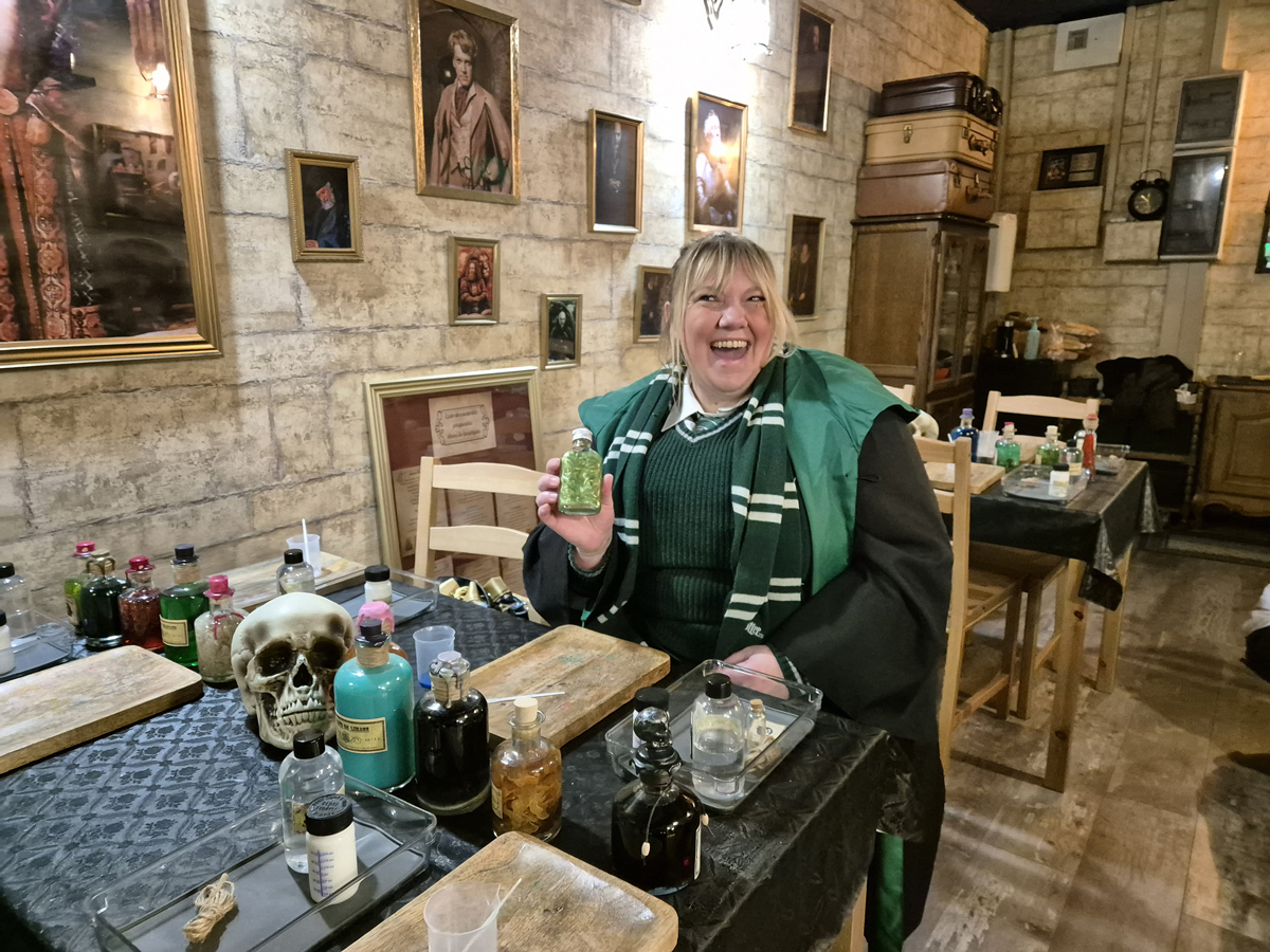 Mais en attendant le créneau qu’elle a réservé, Emmanuelle s’adonne à un cours de potion : « puisqu’on est là autant tout faire ! ». Les fans sillonnent les quelques 4 000 références que comptent les rayons de la boutique, façonnent une mandragore ou dégustent une gaufre pour patienter. Pendant ce temps-là, Cécile, la gérante et Léa Visentini, son acolyte, courent aux quatre coins des lieux et les retours positifs pleuvent déjà. « Tout le monde est ravi ! Il est proche des gens et vraiment là pour eux. Voir les yeux qui pétillent c’est la meilleure des récompenses ! », détaille la première. Entre temps, Emmanuelle, tout aussi conquise, a enfin eu son moment avec l’acteur. « Il est adorable ! C’était vraiment super, je lui ai dis qu’il était génial et il m’a répondu que je disais ça parce que je n’étais pas sa femme. J’ai même eu un câlin ! », sourit-elle. Deux journées hors du temps à Beautiran où tous, en plus d’un moment privilégié avec Jason Isaacs, étaient venus chercher un peu de magie.