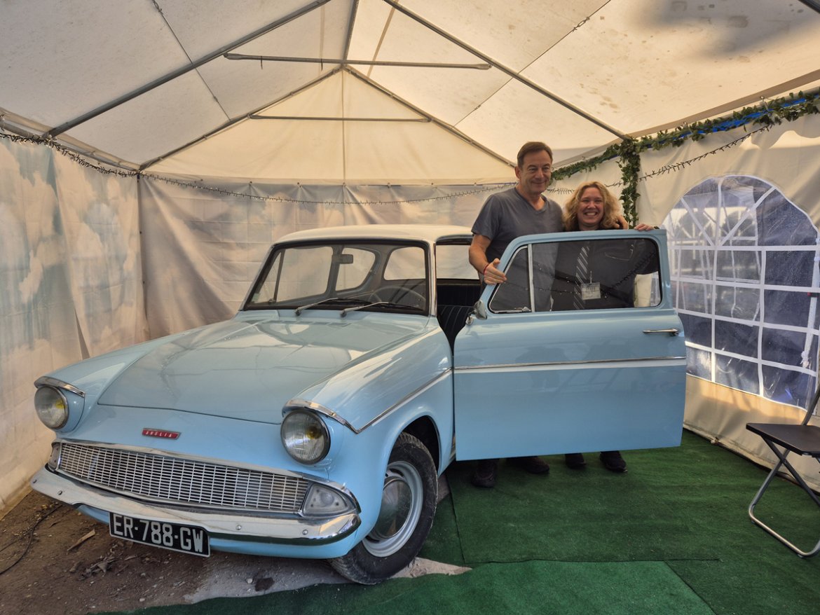 Dix heures sonnent à Beautiran en ce frisquet samedi matin et si le ciel semble faire grise mine, aux abords de la boutique Baguette et Sortilèges, les discussions vont déjà bon train. Si petits et grands visages affichent une mine réjouie, la tension est palpable car tous attendent l’arrivée imminente de l’acteur. C’est alors qu’une berline aux vitres teintées s’arrête devant le portail et qu’en descend un Jason Isaac tout sourire. Prenant le temps de saluer ses fans et l’équipe, il se dirige vers la Ford Anglia de Cécile, la gérante des lieux, pour y dispenser son premier autographe et donne ainsi le « la » pour deux journées de rencontres avec les quelques 500 Potterheads ayant fait le déplacement.