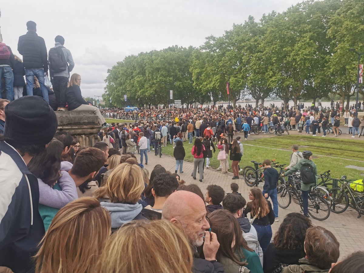 Si environ 10 000 personnes ont pu être accueillies dans l’enceinte du site de célébration de la cérémonie du chaudron de Bordeaux, bien d’autres ont dû la regarder depuis ses portes, sur la place des Quinconces. Toute solution était bonne pour assister à l’événement. Enfants – et amis – sur les épaules, grimpeurs sur les balustrades et lampadaires, et même les téléphones fixés sur des perches à selfie étaient fréquents bien avant le passage de la flamme.