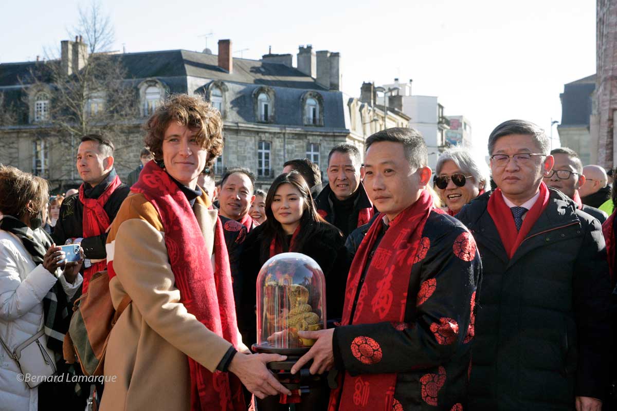Léa André, conseillère municipale déléguée pour les événements et les festivités reçoit des mains du président de l’Association Amicale des Chinois d’Aquitaine le Serpent de bois sous les yeux de Mr Chen Dong