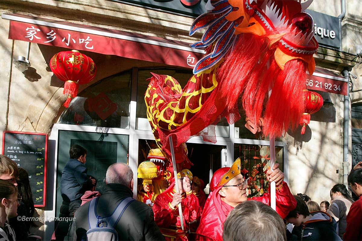Les dragons en visite dans un restaurant chinois rue des Augustins puis ils vont reprendre leur route en visitant quelques adresses de magasins asiatiques ouverts dans la rue en ce dimanche de fête.