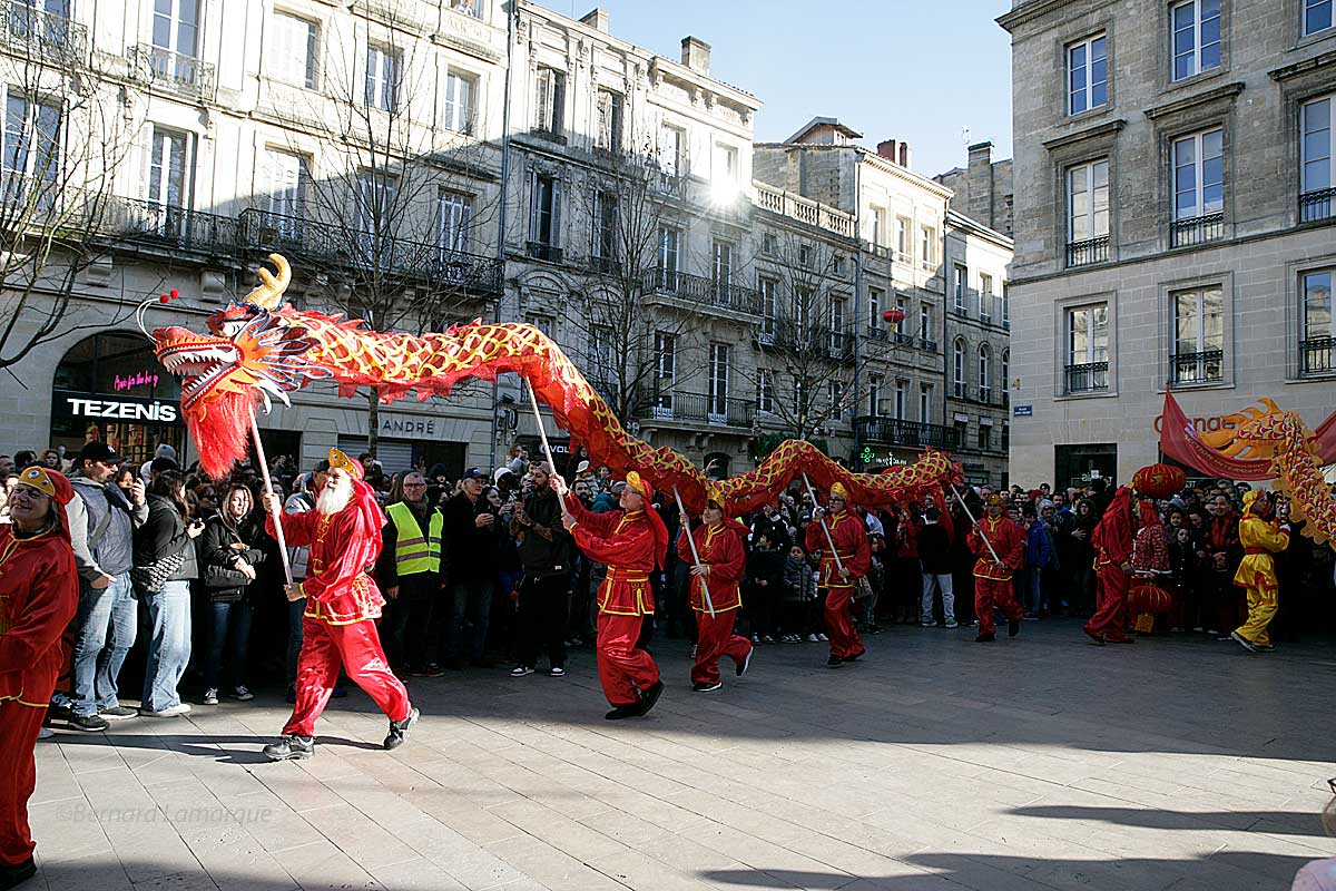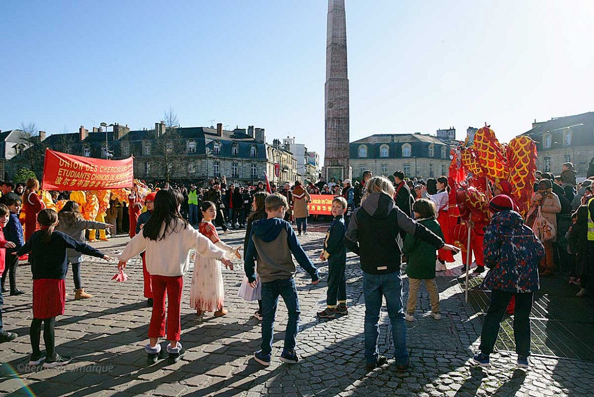 C’est sous le soleil à la Victoire que tout a commencé avec un nombre impressionnant d’enfants plus ou moins habillés style chinois ainsi que quelques adultes. Cette fête est en passe de devenir une date incontournable à Bordeaux avec le nombre important de chinois qui réside non seulement à Bordeaux comme les étudiants mais on en rencontre dans tout l’Aquitaine. Le cortège s’est ébranlé sous la conduite de Stéphane Domecq marquant chaque étape afin que tout le monde puisse réaliser la bonne photo en souvenir de cette bonne journée