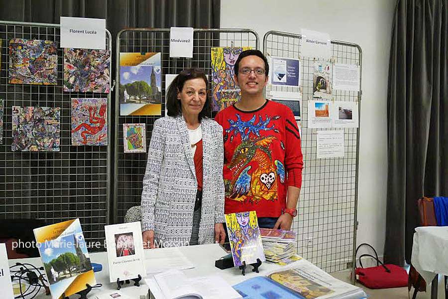 Enfin, je croise un jeune auteur et dessinateur ; Florent Lucéa artiste bien ancré dans le XXI° siècle. C’est lui qui a illustré le livre de poésie de Modvareil. Il est aussi l’auteur de l’affiche si joyeusement colorée du salon.