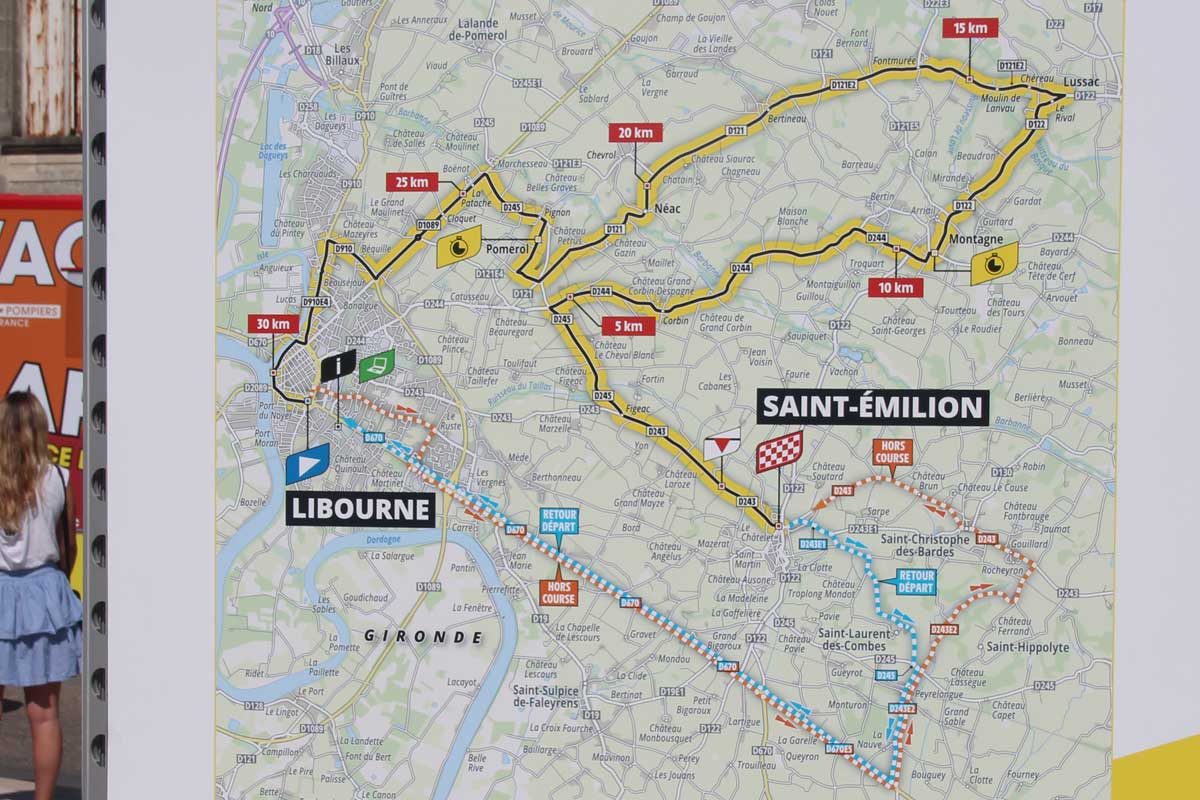 Le parcours exact étant référencé comme tel : Départ Libourne (VC D-910 E4-D910 D1089) - Cloquet - La Patache (D1089 D245) - Pignon (D245 C21) – Pomerol (C21 VC) entrée - Pomerol - Carrefour VC D121 - Chevrol (près) - Néac - Bertineau - Carrefour D121 D121E2 – Fontmurée – Moulin de Lanvau (Lussac) – Chéreau (Lussac) – Le Rival (Lussac) D121 E2 D122 – Montagne D122 D244 entrée – Montagne – Corbin – Carrefour (D244 D245) – Figeac (D245 D243) Saint-Emilion (entrée) – Saint-Emilion arrivée. Il est bien certain que les conditions de circulation pour se rendre dans le secteur vont être très difficile et si on veut aller à Saint-Emilion, prendre le train serait raisonnable car il y a quand même plusieurs TER à horaires raisonnables.