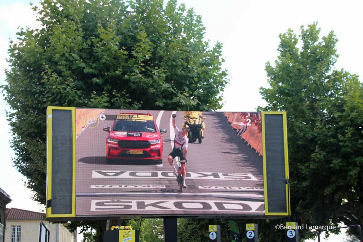 On pouvait suivre l’étape du jour sur grand écran ainsi que l’arrivée, confortablement installé si on n’avait pas envie d’aller se mêler à une foule plus dense, tranquillement installé dans des pliants en toile. Il faut dire que l’arrivée ce n’est que l’arrivée avec protocole et podium sans la possibilité d’approcher les coureurs qui sont dans leur bulle pour éviter toute contamination. Le vainqueur de l’étape Matej Mohoric est arrivée avec une très confortable avance sur le peloton de 20 minutes 50 franchissant seul la ligne. Samedi la foule va se presser au bord du tracé qui va conduire les coureurs de Libourne à Saint-Emilion avec le premier départ à Libourne place Joffre à 11 heures 40. Les coureurs seront visibles intra muros sur trois kilomètres avant d’emprunter l’ancienne 89. Le temps estimé pour parcourir ces trente kilomètres huit cent est de soixante minutes.