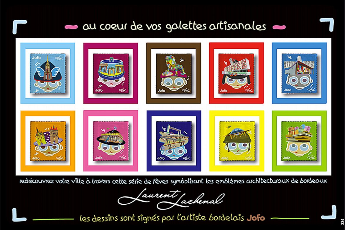 L’inspiration pour la création de ces fèves pour galette de l’Epiphanie (on dit souvent des rois) est loin d’être inconnue pour tous ceux qui suivent l’artiste car elle sortent tout droit de l’exposition que Jofo avait réalisé sur les grilles du Jardin Public qui portait le nom de "Chapo Bordo" inaugurée en septembre 2012 par Alain Juppé et le regretté Dominique Ducassou dans laquelle Jofo avait coiffé la tête à ses totos, son personnage fétiche d’un chapeau décoré par un certain nombre de lieux emblématiques bordelais. Il y avait en tout vingt, 20 toiles réalisées et accrochées sur les grilles du Jardin public qui sont resté un mois entier aux regards du public. Ainsi pour cette série de fèves il y a des créations qui ont été reprises sous une dimension beaucoup plus modeste pour être introduites dans une galette des rois. Depuis 1990 Jofo a créé son monde personnel et son univers plastique des histoires de totos. La force visuelle de son art conjuguée à la tendre insolence de ses sujets ont naturellement impliqué Jofo dans l’art public et aujourd’hui au delà dans l’art pâtissier, on ne va pas manquer de s’arracher ces petites réalisations dont certains font collection avec ardeur et tendresse. Ces petits totos vont attirer la curiosité au delà même de la galette qui sera surement à la hauteur de la pépite qu’elle contient. A travers ce personnage Jofo a saisi l’opportunité de faire un art pop qui embellit le quotidien comme il a embelli durant un moment les grilles du Jardin Public un peu comme aujourd’hui le Street Art peu embellir la ville et la rendre plus distrayante sur ses murs nus.