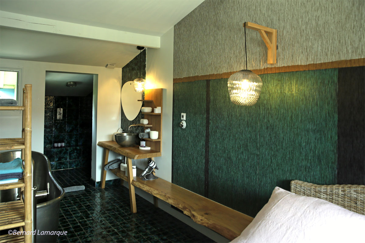Pour élargir sa gamme d’accueil et d’hébergement, Anne Guiot a donc imaginé d’externaliser ses possibilités d’hébergement pour ses clients en offrant un lieu inédit dont la décoration et l’aménagement procède uniquement de ses choix avec le travail des artisans locaux dont un qui travaille le bois avec des chênes d’âge remarquables car très anciens. C’est ainsi qu’ elle a acquis dans le port de Piraillan une cabane de pêcheurs qui a abrité une famille avec deux enfants pendant de nombreuses années pour la transformer en lieu d’accueil hôtelier pour un couple et un enfant avec un confort maximal dans un décor guidé par le choix artistique d’Alice 01001100 en termes de couleur avec ses fameux "harengs" dont le tableau orne le séjour de ce nid douillet. Dans ce lieu tout est travail artisanal dans l’aménagement comme la décoration influencée par à une artiste ou l’on découvre la dominante des tons employés pour colorer le lieu. La céramique artisanale est aussi une invitée de marque de cet espace et s’exhibe sous toutes ses formes : sols, murs mais aussi luminaires, vaisselle, accessoires, mobilier pour donner un cachet unique à la couleur des eaux du bassin. L’originaire d’Arès se déplace avec familiarité dans ce monde du Bassin d’Arcachon qu’elle connaît bien et dont elle apprécie l’ambiance. Tout ceci l’a amené à élargir ses possibilités d’accueil sur le Bassin d’Arcachon aussi au Canon et nous y reviendrons dans un autre article qui parlera de cette quatorzième chambre de l’Hôtel Yndõ.