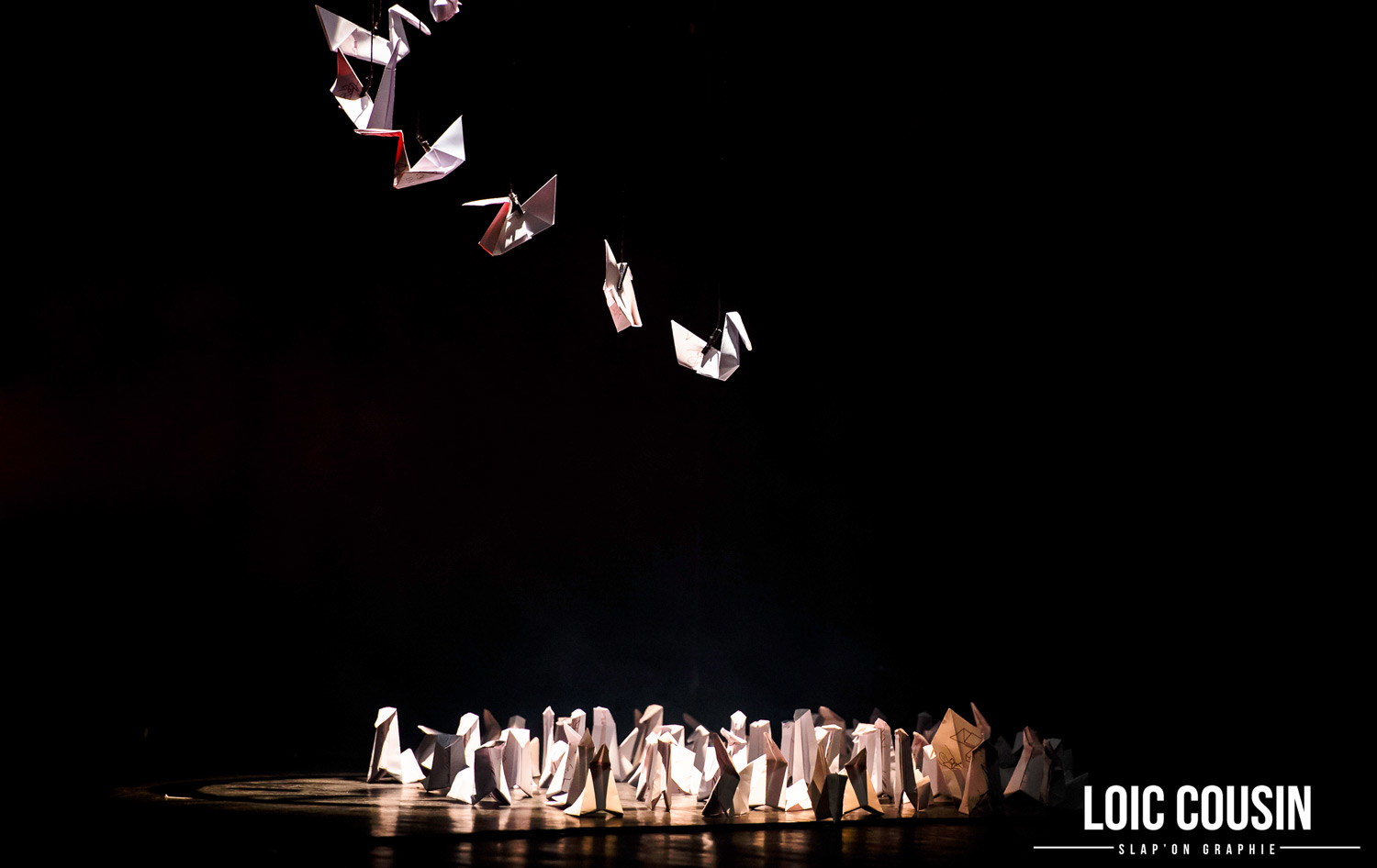 - Les cygnes en origami accrochés sur scène prennent leur envol