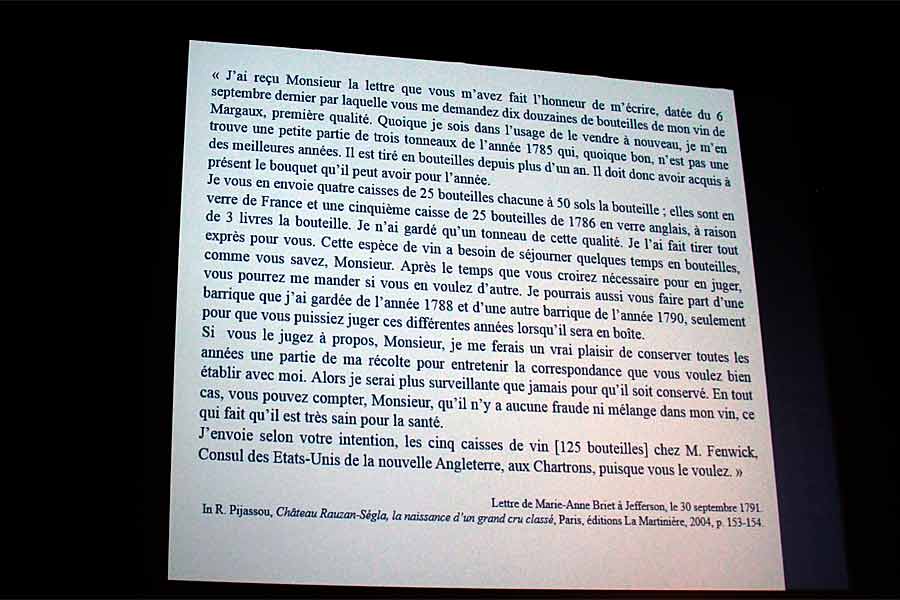 Michel Figeac a su faire toucher du doigt combien ces histoires de familles pouvaient du jour au lendemain réduire à néant des années de patientes constructions par un noble assez peu rigoureux ou par trop dépensier voire carrément aventureux. Il a su montrer à travers l’exemple de la correspondance d’Anne de Briet, encore une femme, avec Thomas jefferson, troisième président des Etats-Unis, que dès les années 1790 les notions de millésimes et de vieillissement apparaissent de manière importante dans le classement des années de récoltes et que progressivement le vignoble se construit sur la qualité. C’est ainsi qu’on a pu apprendre toujours grâce à la correspondance de Jefferson que : "Pour les vins rouges, il y a quatre vignoble de première qualité. 1. Le châteaux Margaux qui appartient au Marquis d’Argicourt et qui produit environ cent cinquante tonneaux, chacun correspondant à mille bouteilles. 2. Latour de Ségur à Saint lambert, qui apparrtient à Monsieur Miromesnil, et qui produit cent vingt cinq tonneaux de vin. 3. Le Haut-Brion dont les deux tiers appartiennent à Monsieur le comte de Fumel qui a passé contrat avec le négociant Barton [...] 4. Le châteaux Lafite, qui appartient au président Pichard, de Bordeaux et qui produit cent soixante quinze tonneaux cité d’après B. Ginestet. Cette situation de la noblesse de robe constituant le vignoble ne se retrouve nullement en Bourgogne où là c’est le clergé qui a joué un rôle moteur dans la constitution du vignoble. On retrouve assez peu ce rôle constructif de la noblesse dans le Saint Emilionais sauf sur quelques châteaux comme le château Figeac ce qui a amusé notre conférencier et si on retrouve un peu des situations analogues en Bergeracois et du côté de Clairac en Lot et Garonne, elle est aussi présente en Madiran. La culture de la vigne n’a pas toujours fait l’unanimité avec ce conflit cité par Michel Figeac, de la palus d’Ambares qui avait été asséchée par les hollandais pour y cultiver des céréales et ou on a mis de la vigne. Ainsi c’est une histoire compliquée et parfois tumultueuse que cette histoire du vignoble bordelais mais haut combien passionnante que cette histoire de la vigne à Bordeaux et cette histoire ne valait-elle pas une Cité !