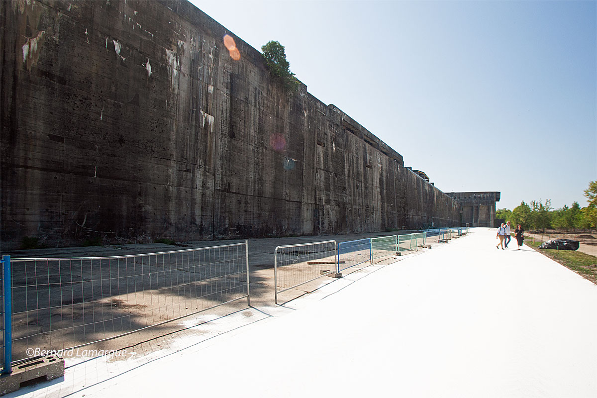 La découverte visuelle que l’on peut faire maintenant de cette face Nord fait apparaître qu’en fait la base Sous Marine n’a jamais été terminée quand on découvre les ferraillages encore apparents sur certaines parties de cette façade Nord. Quand le parc sera terminé ce sera un parc de quatre hectares de superficie, ce qui équivaudra à la surface du Parc Rivière, le Jardin Public restant le plus grand espace vert avec ses sept hectares disponibles. Pour l’instant c’est à peu près la moitié de la surface totale qui a été aménagée car il a fallu enlever tout le goudronnage qui recouvrait ces surfaces pour pouvoir désimperméabiliser cette importante surface étant donné qu’aujourd’hui pour la gestion de l’eau en milieu urbain, il est important de récupérer des surfaces perméables pour éviter la saturation des réseaux d’évacuation des eaux pluviales, réseaux qui sont souvent mal entretenus et mal désherbés par les riverains qui ont presque toujours de la peine à se baisser car aujourd’hui les désherbants chimiques sont interdits. Alors la ville végétalisée oui mais pas les caniveaux végétalisés car ces derniers bouchés engendrent des chaussées inondées comme on peut le voir souvent dans certains quartiers de la ville.