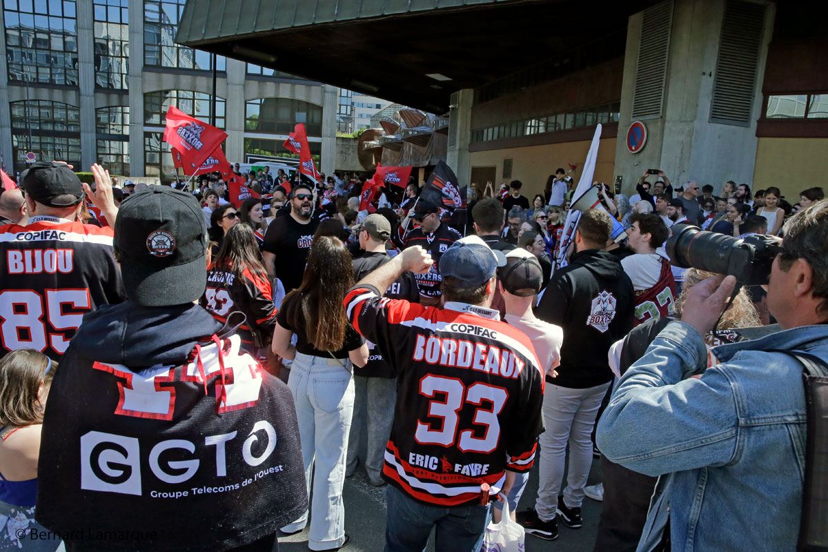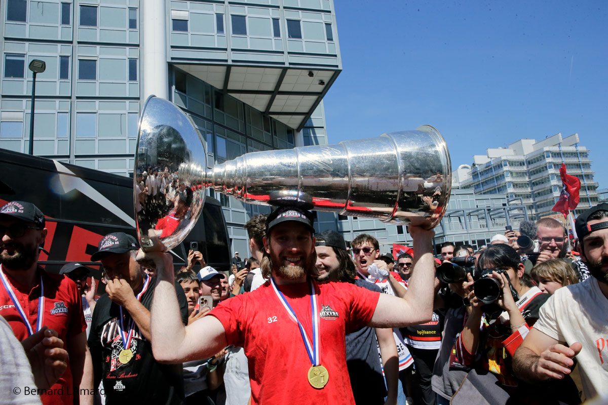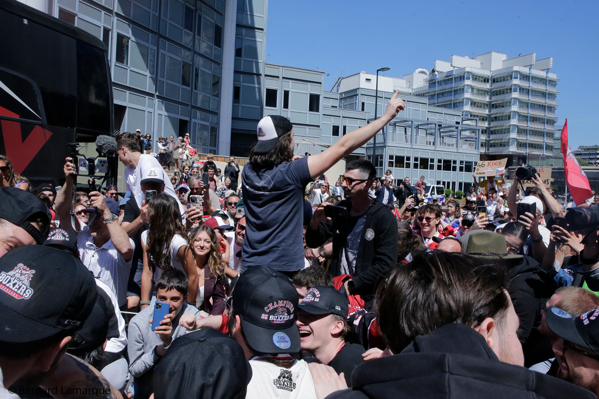Il était 14 heures 14 ce dimanche quand le bus transportant les Boxers s’est présenté derrière la patinoire permettant d’accueillir la victorieuse phalange qui ramenait la Coupe Magnus de Grenoble qu’elle a chèrement acquis au cours du match cinq de la série finale.