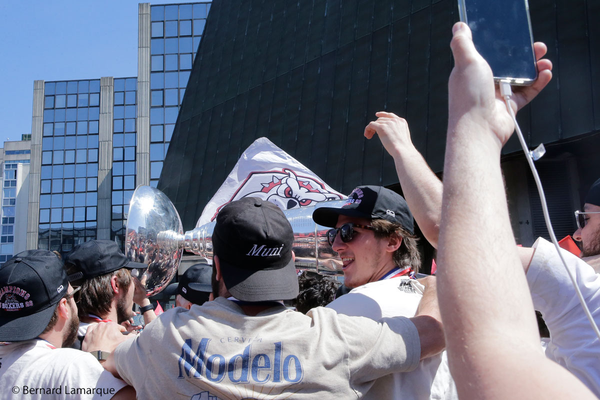 La bousculade continue mais la Coupe change de main pour que tous les joueurs participent à la fête et qu’il n’y ait pas d’exclu