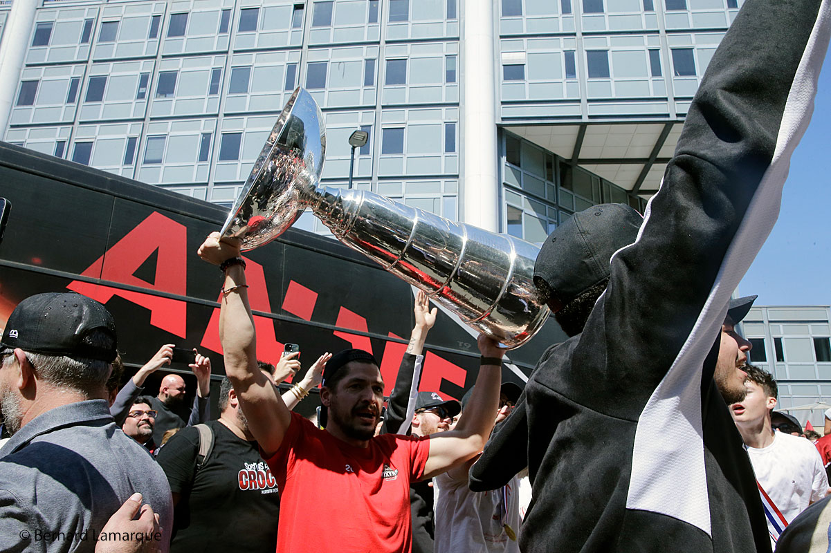 A la descente du bus la Coupe passe de mains en mains et chaque joueur tient à la brandir devant son public et ses supporters assemblés.