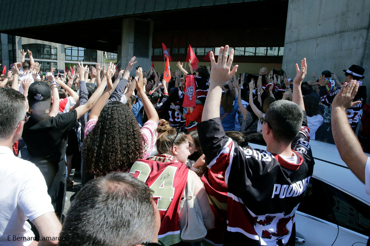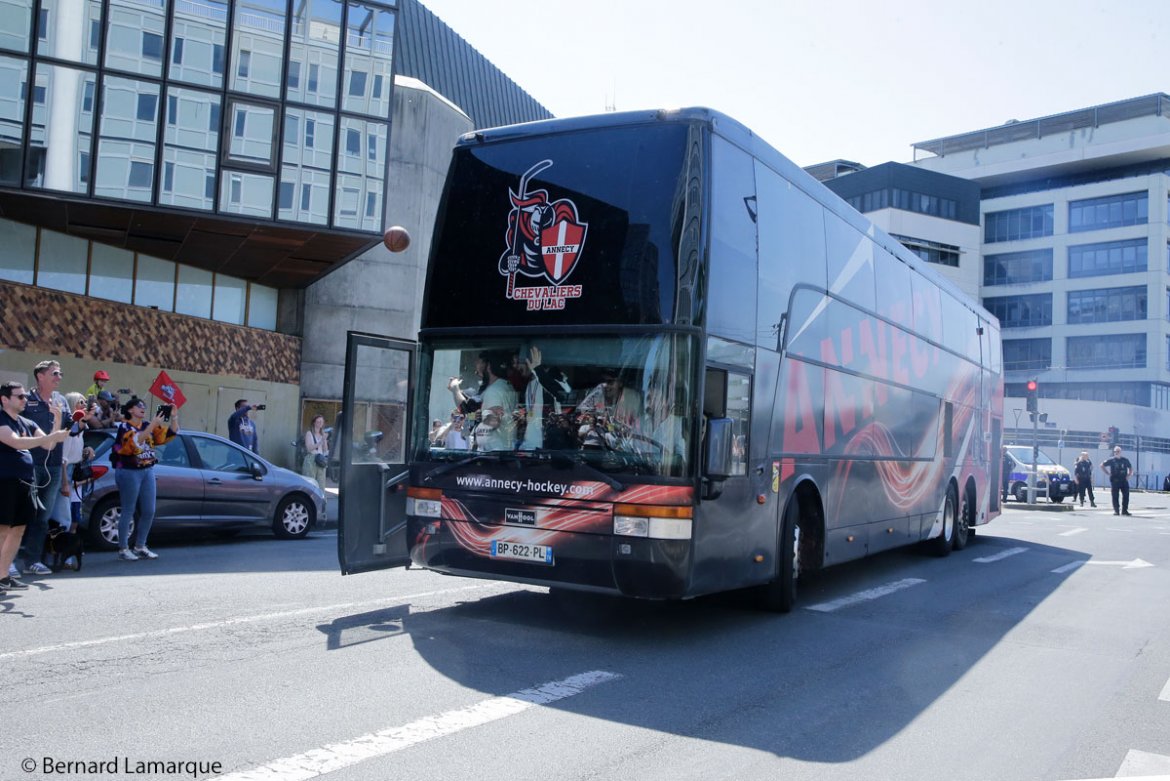 Suivant le bus des joueurs le bus des familles arrivent et tout le monde va se joindre à la fête de réception des supporters côté Nord de la patinoire.