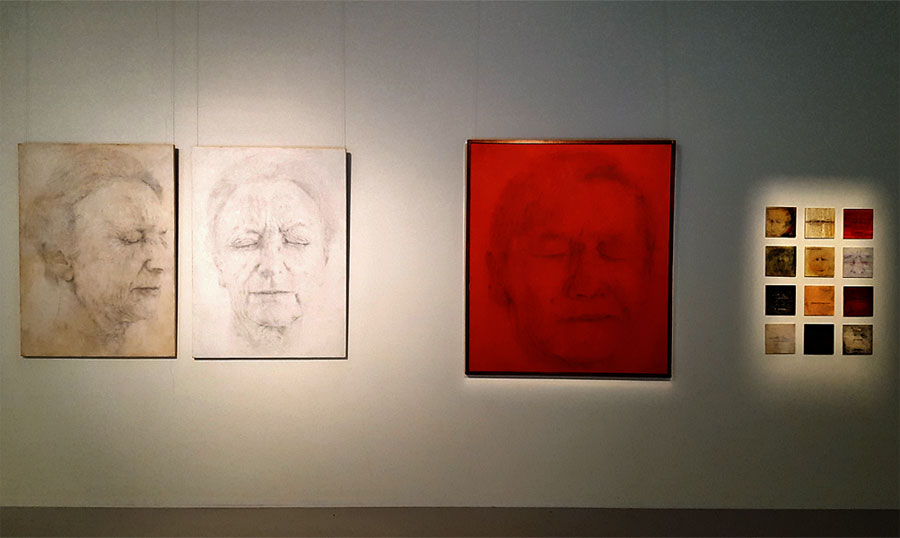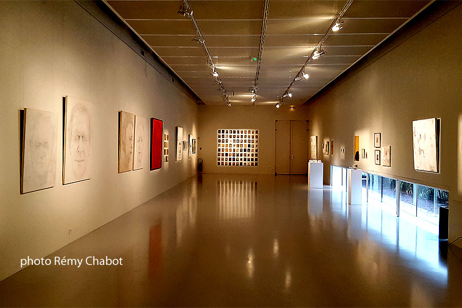Dans ces oeuvres réalisées sur bois enduit, ce dernier s’est inspiré de plusieurs artistes comme Martial Guédron, Jérôme Bosch ou encore Arnulf Rainer. Les tableaux de Luc Detot sont très souvent monochromes et sont représentés dans trois couleurs principalement : le blanc, le noir et le rouge. Dans la Salle d’expositions du Centre d’Arts, vous pourrez aussi admirer une série de pièces intitulées "Ex-voto". Ces sculptures en terre crue assimilées à des yeux, sont réalisées avec de l’huile et de la cire sur terre. "Figura" (en latin la forme, l’apparence) propose donc un retour sur les dessins de Luc Detot autour du visage humain depuis plusieurs années. Ces derniers ayant évolué au fil du temps en passant d’une expression du visage plutôt neutre à une tête grimaçante. Ces oeuvres ont toutes en commun d’être vues de face, les yeux fermés ce qui fait apparaître les traits du visage.