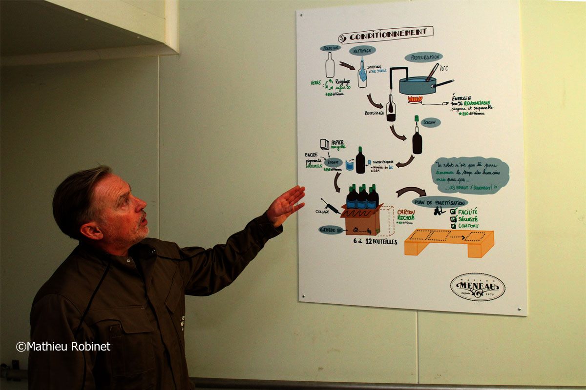 Visite guidée sur le site de production, avec des procédures artisanales et industrielles mêlant savoir humain et technologiques. Une « petite usine » à 4 millions d’unités par an, à la pointe du progrès : sélection, dissolution, cuverie, laboratoire analyse, recherches et développement, packaging, communication, stockage et expédition qui ne prêtant pas rivaliser avec Teyssere qui produit par jour ce qu’il produit à l’année. La différence est dans le goût qui explose en bouche, un vrai retour en enfance au pays du goût. Sucre des Antilles et fruits d’Aquitaine, vraiment merveilleux pour une identité propre. Sirops, soda, jus de fruits et légumes, nectars, smoothies, thés glacés infusé grâce à leur propre matériel, bières, boissons aromatisées à base de vin Bio... tout est nature et c’est vraiment excellent. Vous pouvez les retrouver chez Biocop ,surtout à l’épicerie de Darwin ainsi qu’à Auchan et Carrefour. Cet attrait pour le biologique et l’écologique s’est mué en une philosophie de vie chez Meneau. C’est le choix de la qualité pour le bien-être.