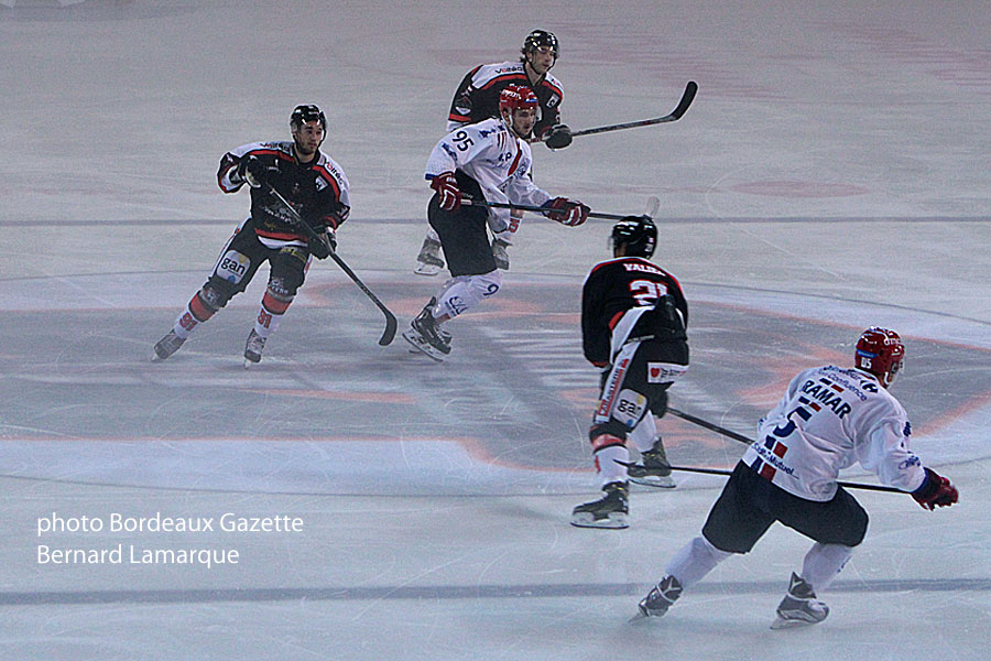 Le match commence sur un gros rythme. Bordeaux domine et multiplie les belles occasions mais Pintaric préserve le but Lyonnais magistralement (20 arrêts). Les Lions jouent leur chance en contre et surprennent même en ouvrant le score (0-1 à 9’03). Le second tiers commence sur un rythme moins relevé et un jeu plus direct. A la mi-tiers, sur un petit jeu de passes, Charland trouve Petit qui trompe enfin le portier Lyonnais (1-1 à 29’46). Les Bordelais jouent une grande partie du tiers en supériorité mais ne réussissent pas à retrouver le fond des filets.