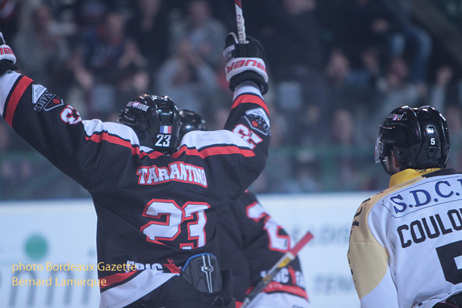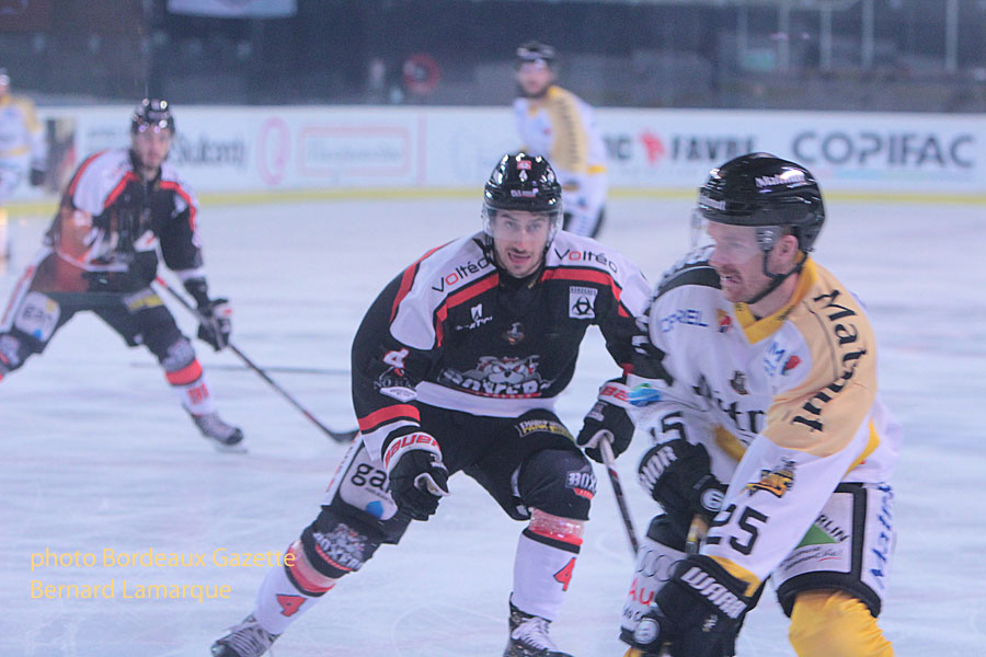 Le troisième tiers commence par une grosse domination des Dragons bien décidés à revenir dans la partie. La défense Bordelaise tient bon mais finit par céder en infériorité (but de Rouen 2-1 à 45’52). Après le temps fort des Dragons, le jeu s’équilibre et baisse en intensité. Un petit but d’avance c’est peu et on sent que le match peut basculer d’un côté comme de l’autre. C’est en toute fin de tiers (il reste 1’14) que les choses se gâtent : les Dragons en supériorité sortent leur gardien et jouent le tout pour le tout à 6 contre 4. Ce n’est vraiment pas passé loin jusqu’à la dernière seconde !