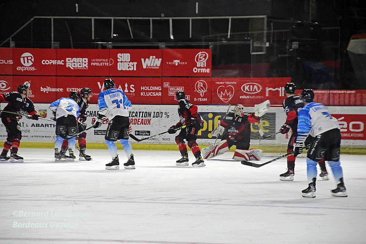 Si les visiteurs sortaient vainqueurs de leurs cinq dernières rencontres, Bordeaux était bien décidé à montrer les crocs et à toucher du doigt la cinquième place du classement. Dans une première période à l’ambiance quelque peu étrange, les Rapaces semblent bien décider à voler dans les plumes de la défense bordelaise. Par chance, c’est un gardien bien réveillé qui surveille sa cage en attendant celui des troupes. Il arrive après plusieurs pénalités sifflées aux deux équipes et la fin de période est dominée par Bordeaux. Le second tiers-temps s’ouvre sur un but bordelais qui réchauffe les esprits et offre un regain d’énergie aux Boyz devant une patinoire glaciale. Les Boxers dominent physiquement et montent aux buts en ne cessant de talonner Gap. La tension se fait sentir avant le deuxième coup de sirène et la troisième période s’ouvre sur une offensive bordelaise. Les Rapaces resserrent les rangs et semblent reprendre l’avantage sans parvenir à briser la défense bordelaise.