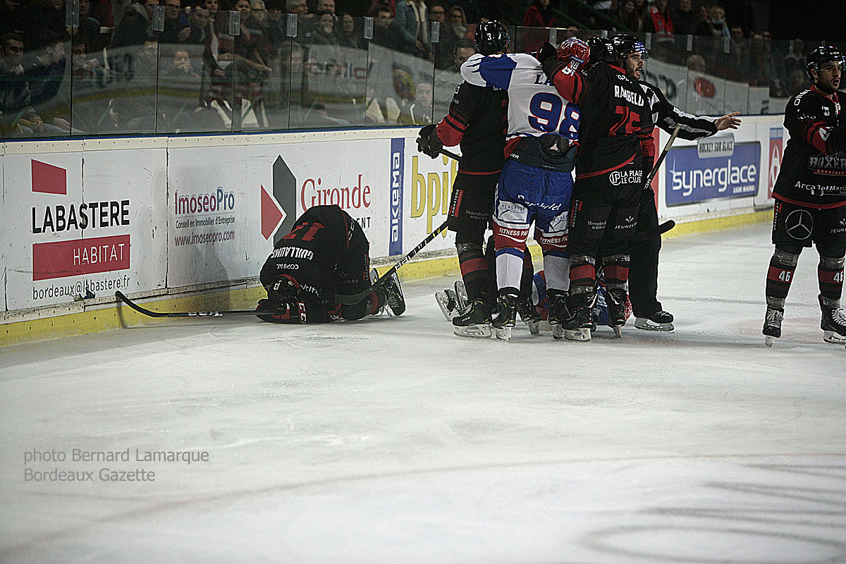 Le match a démarré sur un genre de faux rythme dans lequel les lyonnais ont cherché le contre alors que les Boxers fidèles à leurs habitudes cherchaient à bombarder le portier adverse. La tension s’est installée rapidement avec une prolifération de fautes jusqu’au très vilain geste sur Julien Guillaume qui a valu aux Lyonnais de jouer pendant 5 minutes en infériorité numérique pour pénalité majeure accompagnée de 20 minutes de méconduite de match permettant à Peter Valier d’ouvrir le score. En seconde période les Lions ont bien tenté de revenir mais ce sont les Boxers qui ont enfoncé le clou en scorant à deux reprises avec un Glass qui s’est bien fait pénaliser surement énervé par ce qui était arrivé à Guillaume car ce genre d’épisode au USA débouche toujours sur de sacrés représailles mais le hockey hexagonal est plus soft. Les Boxers n’ont pas laissé le temps de respirer à la reprise du troisième tiers temps aux visiteurs et le score en restera là avec donc un doublé de Valier et une victoire qui fait du bien.