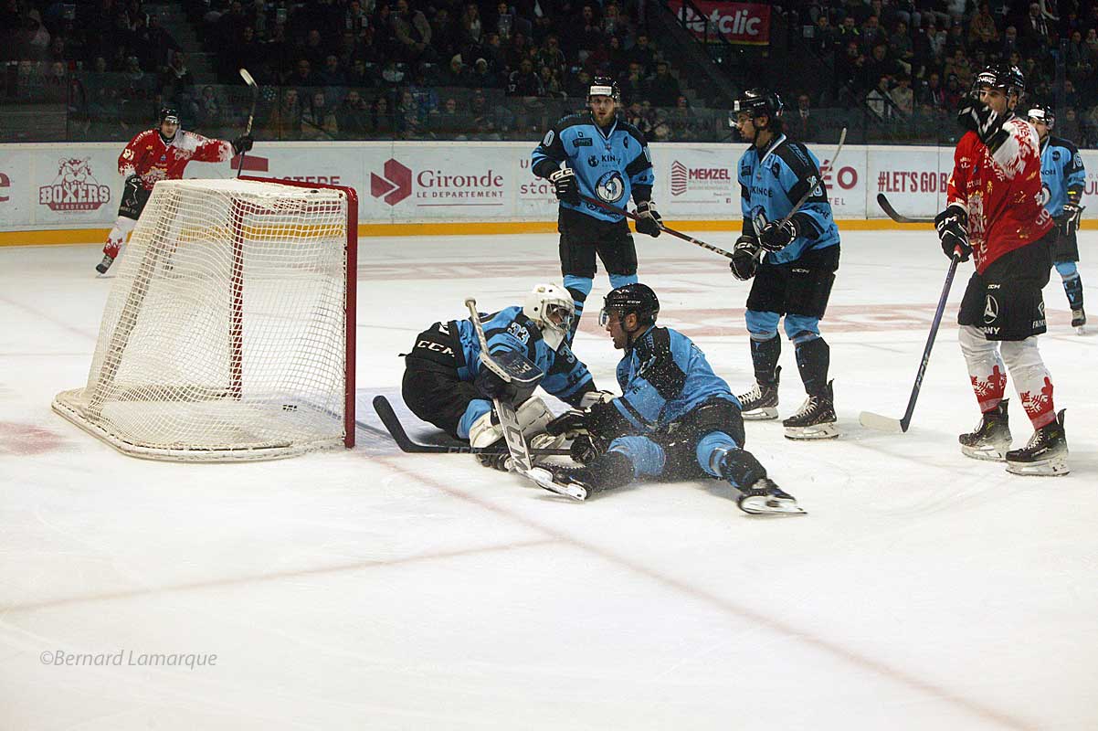 Surprise pour les deux tiers temps restants, les entraineurs ayant surement passé des consignes strictes de serrer la défense, l’espoir du public de voir de nouvelles réalisations ce sont résumées à une réalisation par tiers temps avec les Boxers prenant l’avantage durant le deuxième tiers temps. Ils ont conservé l’avantage au cours du match durant de nombreuses minutes mais c’est au cours du troisième tes temps à deux secondes de la fin d’une période en infériorité numérique qu’ils ont vu les visiteurs égaliser alors qu’ils avaient l’air de tenir la victoire. Les défenses prenant le pas sur les attaques malgré de vigoureuses réactions des deux côtés plus rien n’est marqué jusqu’à la fin du match qui se termine par le score de trois à trois. La prolongation ne donnant rien, on passe à la fusillade. La, une coquinerie de l’entraineur bordelais en changeant de portier va permettre aux locaux grâce à Bodin dont le jeu est moins connu des attaquants Marseillais de faire la différence en stoppant trois tirs. De leur côté Bruch, Pompei et Poudrier trouvant l’ouverture et Marseille ramène un point sur le Vieux Port