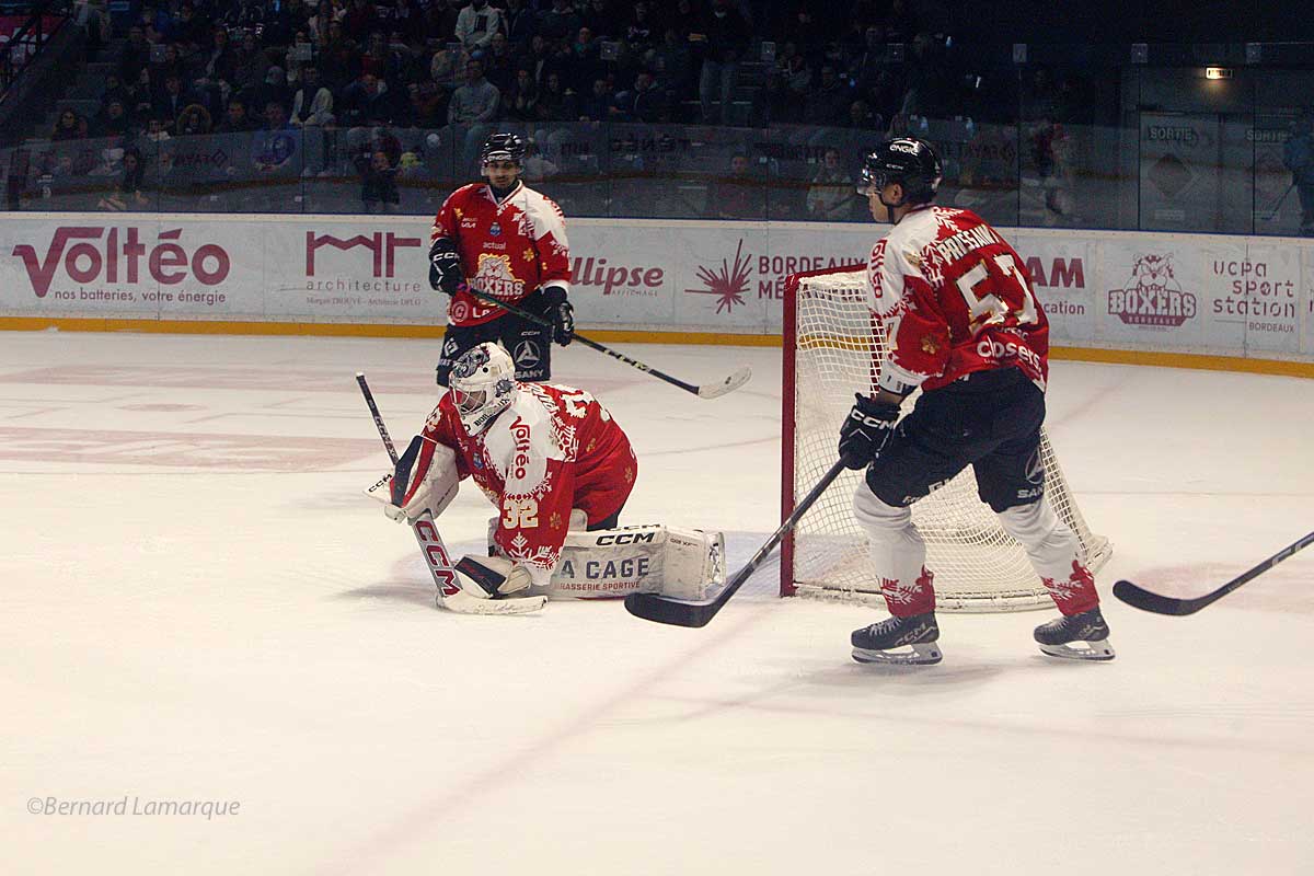 La rencontre a démarrée à cent à l’heure et ce sont les visiteurs qui ont ouvert le score dès la 6ème minute un peu contre le cours du jeu car les Bordelais mettaient la pression mais un contre rondement mené permettait aux Marseillais d’inaugurer le score. Les locaux ne sont pas resté inactifs et ont très rapidement répondu dès la première supériorité numérique puis ont remis ça au cours d’une nouvelle supériorité numérique, la troisième car les Marseillais commettaient beaucoup de fautes en ce début de match. Les visiteurs ne sont pas restés tétanisés et ont remis les deux équipes au même niveau soit deux à deux à la fin d’un premier tiers temps très animé et spectaculaire. Dans es gradins on commençait à se frotter les mains en espérant voir encore beaucoup de réalisations, rendant le match très attractif avec des Boxers équipés de leur maillot de Noël au rouge chatoyant face au bleu des Spartiates qui fournissaient la réplique.
