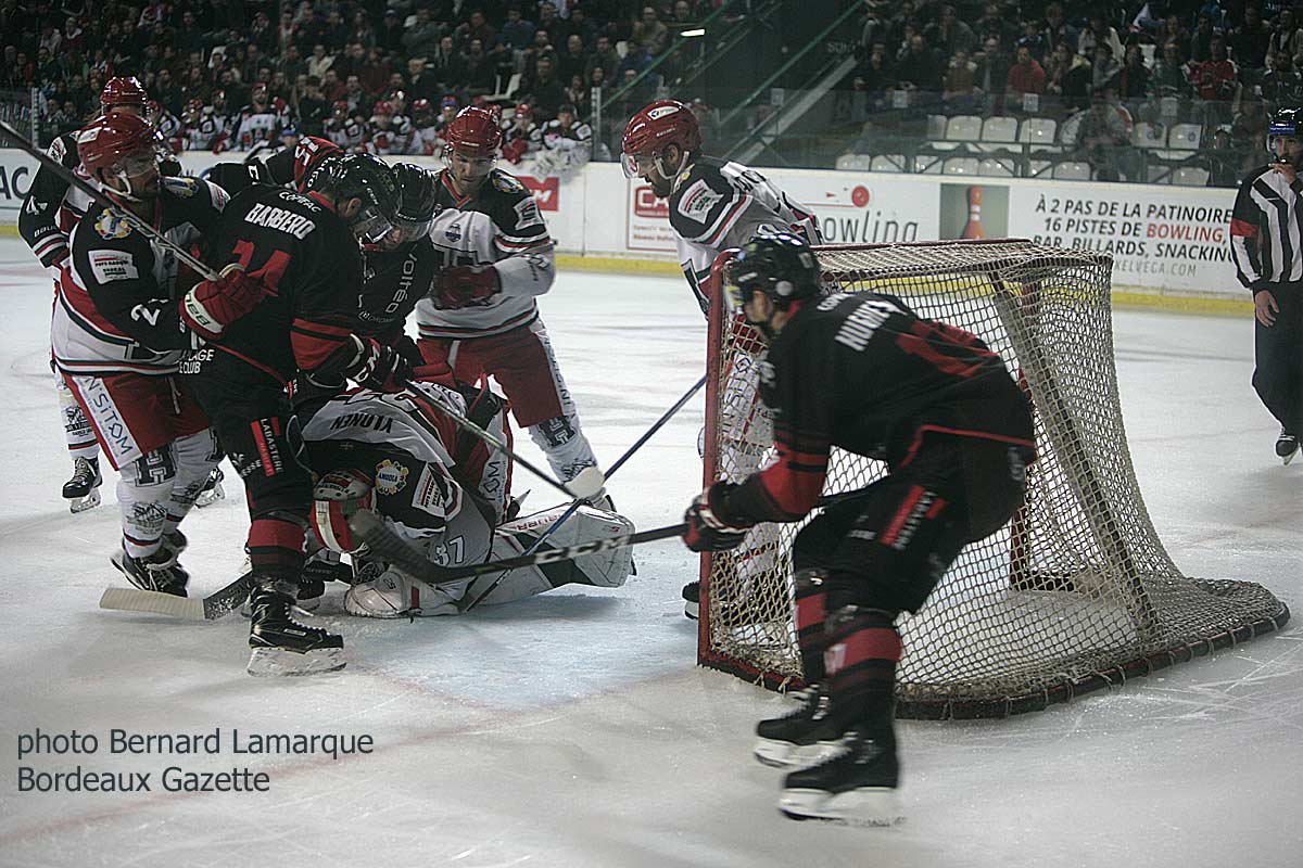 Surement que l’Hormadi avait pris un ascendant psychologique sur les Boxers en les sortant de la Coupe de France sur leur terrain d’Anglet, mais là un peu plus fort ils sont venus s’imposer à Mériadeck les joueurs d’Anglet ! L’Hormadi a même fait tout le match en tête et est-ce que cela correspondrait à une baisse de régime des Boxers, il est trop tôt pour le dire. La pénalité de neuf points les a obligé à un rythme d’enfer en début de saison mais il ne faudra pas trop s’en écarter avec cette très lourde pénalité qu’il est nécessaire de gommer pour rentrer dans le Top 8 des Playoff. Les Boxers se sont fait surprendre deux fois alors qu’ils évoluaient en supériorité numérique par deux anciens bordelais Decock et Tarantino et de la même manière. Dans l’ensemble très grosse partie où le palet a bien circulé et ou l’ancien Boxer Sebastien Ylonen a maintenu sa cage inviolée pendant les deux premières périodes. Les Boxers se sont réveillés trop tard et même à 6 joueurs de champ contre 5 pendant 1 minute 30 ils n’ont pas réussi à revenir au score et refaire la différence d’un but qu’il restait à combler. Dans chaque confrontation perdue les Boxers se sont inclinés d’un petit but mais malheureusement perdre c’est perdre.