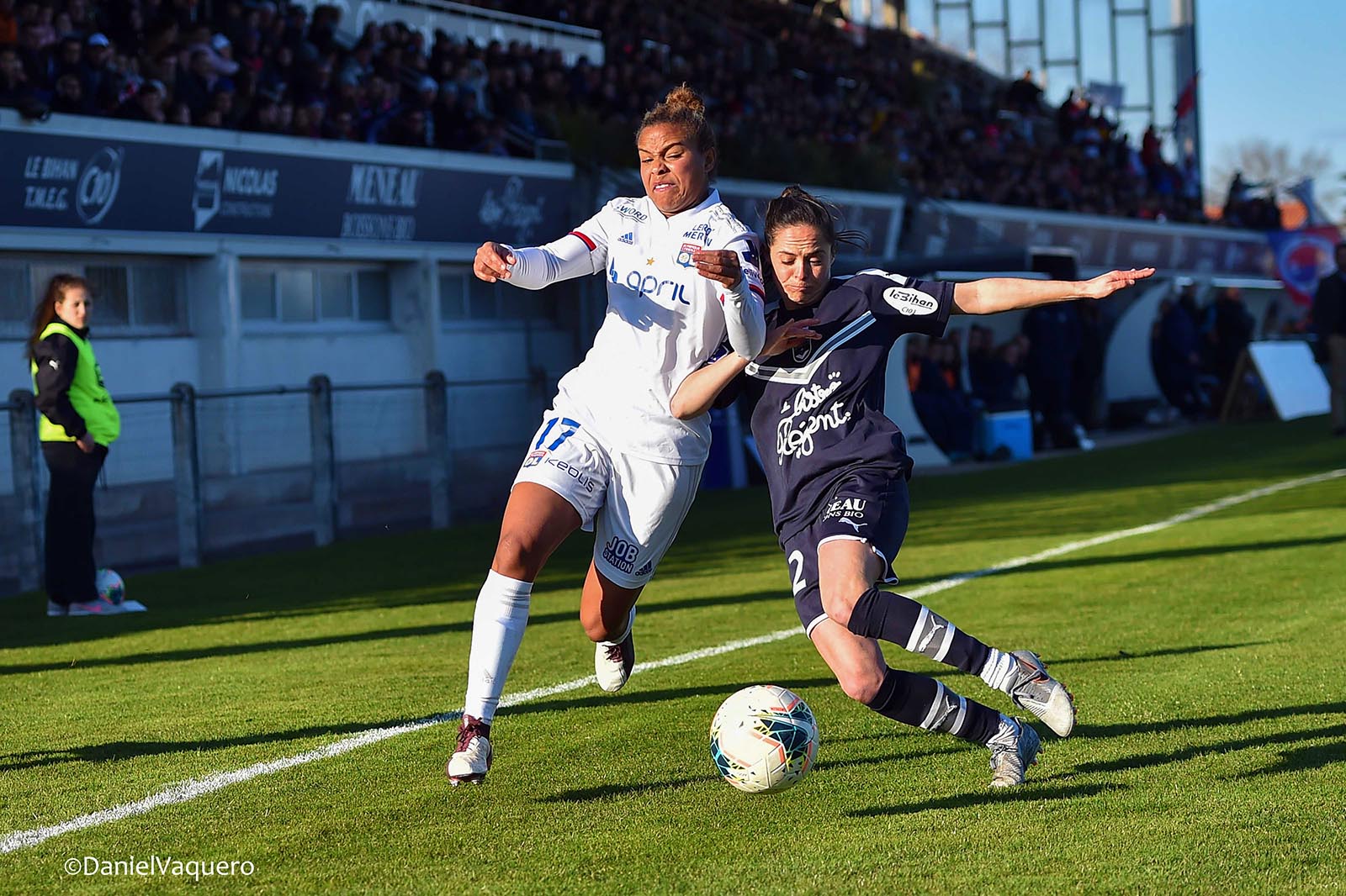Une vingtaine de minutes sont passées et les bordelaises ont défendu bec et ongle avec une rare énergie tout en ne perdant pas leur fil conducteur du jeu. L’avant centre lyonnaise Hegerberg ne trouve pas le cadre de la tête (20’) et imperceptiblement le match va s’équilibrer petit à petit à partir de ce moment. Les lyonnaises ont toujours l’initiative mais le milieu bordelais commence à reprendre de la vitalité. Et quand Lavogez et Asseyi sont servies dans le cœur de la défense lyonnaise le match prend une autre tournure. Une belle partie d’échec se met dès lors en place entre ces deux équipes tournées vers le beau jeu. Ce qui n’empêche pas l’âpreté des débats, Henry en fer de lance des visiteuses donne de sa personne aux quatre coins du terrain et est avertie tandis que Shaw fait parler sa puissance. L’internationale lyonnaise Mbock fait les frais de cette débauche d’énergie en quittant ses partenaires à la demi heure en retombant mal sur son épaule.