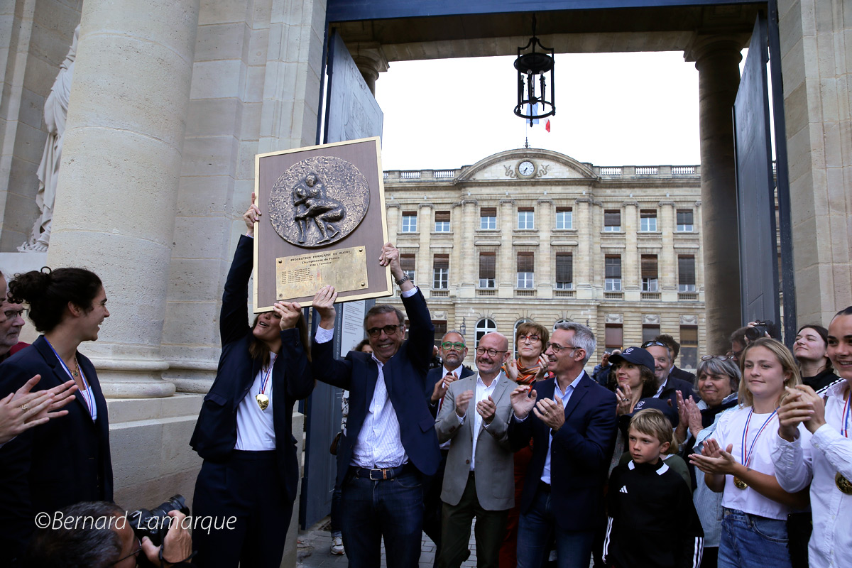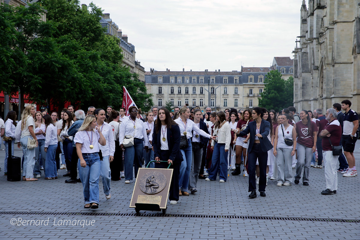 Pour cette réception en Mairie bien sur tout le monde était là avec la présence du Président du Conseil Départemental Jean-Luc Gleyse, l’adjoint au maire chargé des Sports Mathieu Hazouard ainsi que Brigitte Bloch, conseillère déléguée au Tourisme et à l’économie du vin sans oublier Laurent Guillemin. Pierre Hurmic a délivré un petit discours du haut des marches de la cour du Palais Rohan en signalant que dans les dernières minutes du match à Clermont elles avaient fait peur à leur supporters jusqu’au moment de délivrance de l’interception d’Aubane Rousset qui a tué le match et les Toulousaines. Il a ensuite évoqué l’historique de ce club né en 1889 comme l’un des plus anciens clubs de rugby français qui voit son histoire renouvelée avec cette équipe féminine qui n’en finie plus de gagner avec ce troisième titre consécutif conquis quand même sous un maillot couleurs UBB car à Bordeaux l’organisation du rugby est complexe mais néanmoins fructueuse entre garçons et filles. Il a tenu aussi à souligner que le démarrage du rugby en province s’est fait à partir de Bordeaux (pour preuve le nombre de clubs de haut niveau en Aquitaine. NDLR) Le discours du maire a été régulièrement ponctué de salves de joie et d’applaudissements des joueuses et des présents.