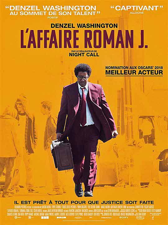 Synopsis : À la mort de son mentor, Roman J. Israel, avocat aussi idéaliste que déterminé, voit sa vie bouleversée. Dans l’univers des tribunaux surchargés de Los Angeles, celui qui fut son modèle et une figure légendaire des droits civiques laisse un vrai vide. Recruté par l’ambitieux George Pierce, Roman se lie d’amitié avec une militante de l’égalité des droits. Confronté à des événements extrêmes, il va pourtant remettre en question l’engagement qui a déterminé toute sa carrière…