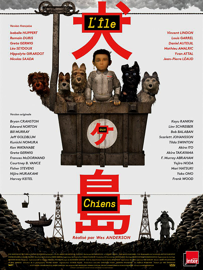 Synopsis : En raison d’une épidémie de grippe canine, le maire de Megasaki ordonne la mise en quarantaine de tous les chiens de la ville, envoyés sur une île qui devient alors l’Ile aux Chiens. Le jeune Atari, 12 ans, vole un avion et se rend sur l’île pour rechercher son fidèle compagnon, Spots. Aidé par une bande de cinq chiens intrépides et attachants, il découvre une conspiration qui menace la ville.