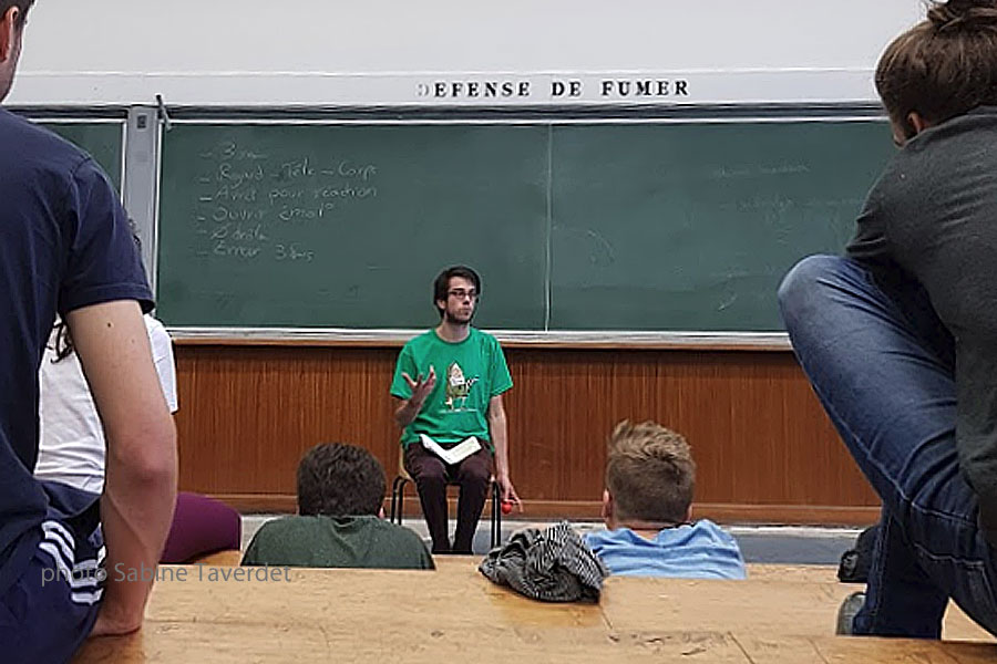 En ce mardi soir, il fait déjà presque nuit mais la porte de l’amphi de mathématiques ne cesse de s’ouvrir. Les jeunes acteurs entrent au compte-goutte pour la répétition hebdomadaire. Certains, étudiants, sortent de cours, d’autres du travail ou embaucheront plus tard. Les blagues fusent entre les habitués, et les anciens mettent à l’aise les nouvelles recrues de ce début d’année. La Lubrik est une troupe de taille moyenne qui compte une vingtaine de personnes et qui met un point d’honneur à ne pas dépasser un nombre trop important d’acteurs « pour garder une cohésion de groupe forte » intime Clément, joueur mais aussi président de cette association étudiante. Puis les ateliers commencent sous la direction de Léo, professeur du jour. Les quolibets se taisent peu à peu, l’ambiance devient feutrée, les regards sont concentrés vers la scène où ils acteront chacun leur tour. On oscille entre rire et larmes. Chacun se livre et touche ses camarades à sa façon. « Le but est de faire une histoire qui se tient en jouant avec l’autre ». Ils viennent tous pour des raisons propres, mais la passion est la même. Et les fils se lient doucement pendant les entraînements.