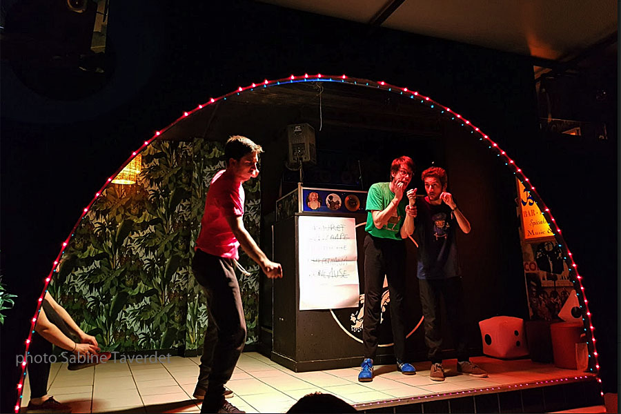 Le mercredi suivant, l’air est froid à 20h devant la Maison Ausone. Mais dès qu’on passe la porte du bar les esprits se déglacent. Il y a tant de monde que l’on s’assoit sur des tables disposées devant la scène, certains resteront debout jusqu’à la fin. Marie-Jo, la propriétaire de l’établissement aime ses rendez-vous avec le théâtre d’impro, un partenariat à d’ailleurs été passé avec la Ciguë, une autre équipe bordelaise. « Ici on aime l’expression, orale, musicale… Le théâtre d’impro fait partie de la vie du bar ! ». C’est contre cette équipe que va jouer la Lubrik mais l’ambiance n’est pas à la compétition. Mathieu, membre de la Ciguë nous intime qu’« il y a un temps d’adaptation pendant l’entraînement d’avant-match, mais c’est jouer ensemble qui est intéressant, c’est le but premier ». Pas vraiment le score donc. Il y a pourtant un arbitre qui fait son entrée sous les huées après les 5 min d’entraînement réglementaire des deux équipes : cris, gesticulations, cache-cache dans le public, grimaces… Les coachs n’épargnent rien aux acteurs mais nous donnent tout : c’est une manière d’enfiler le costume devant le public, on entre dans le match avec eux.