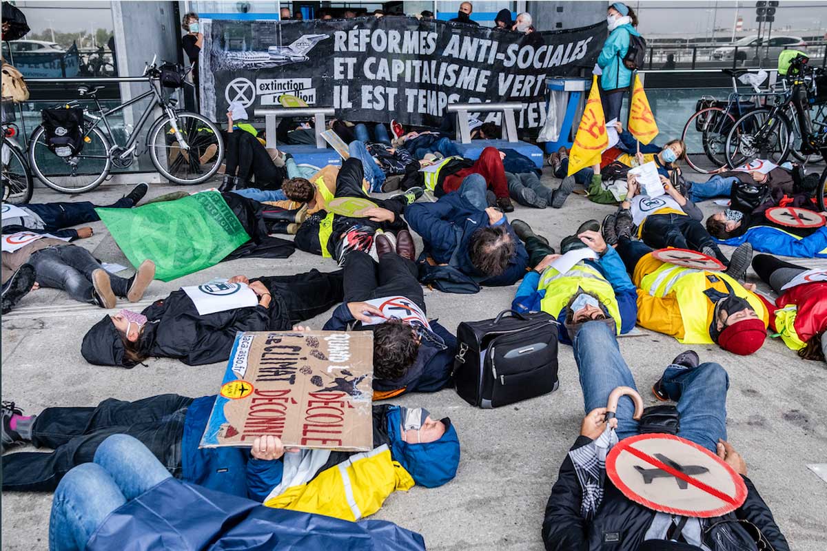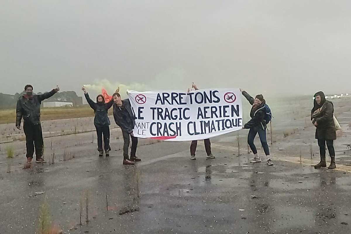 Une fois sur place des prises de parole ont été faites pour appeler à une réduction du trafic aérien et à la reconversion des employés du secteur aéronautique. Nous avons rappelé que l’avion est le mode de transport le plus polluant, le plus inégalitaire et le moins nécessaire. Les manifestants ont chanté dans une ambiance festive et ce, malgré les éléments météorologiques qui se déchainaient pendant toute l’après-midi et la forte présence des policiers. Les marcheurs ont effectué un die-in devant les portes pour réclamer la diminution drastique du trafic aérien. Anais rappelle « Continuer de croire dans la massification du transport aérien, c’est acter la défaite de nos politiques d’atténuation et d’adaptation aux impacts du dérèglement climatique. C’est encore évitable si la sobriété occupe une place sérieuse dans la transformation de ce secteur ». Claire continue « Les subventions régionales et locales versées aux aéroports et les compagnies aériennes, l’exonération de taxe du kérosène et la faible TVA appliquée sur les billets d’avion font porter un effort économique fourni par toute la population pour maintenir un mode de transport utilisé par une minorité de personnes. Il faut réduire le trafic aérien de toute urgence »