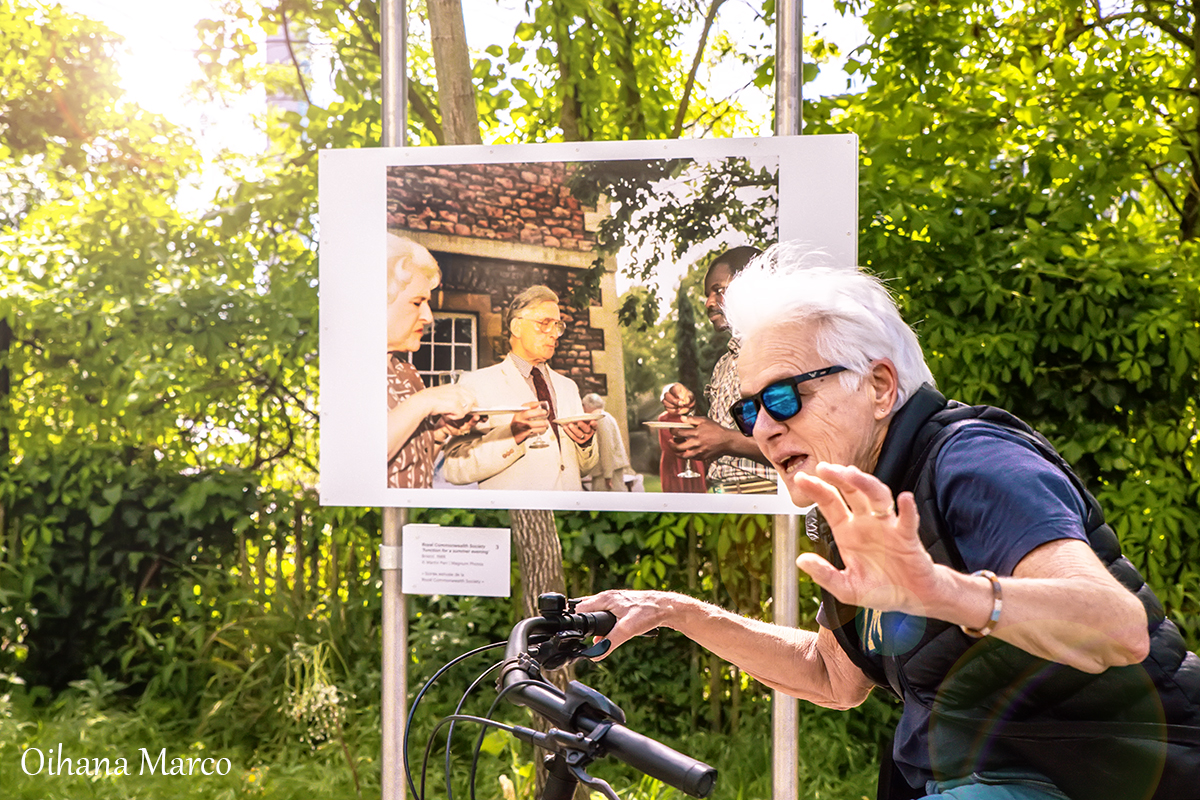 - La visite guidée rassemble les regards autour des images. Dans cet accrochage extérieur, les photographies ne sont pas isolées : elles cohabitent avec les visiteurs, la lumière et les jardins.