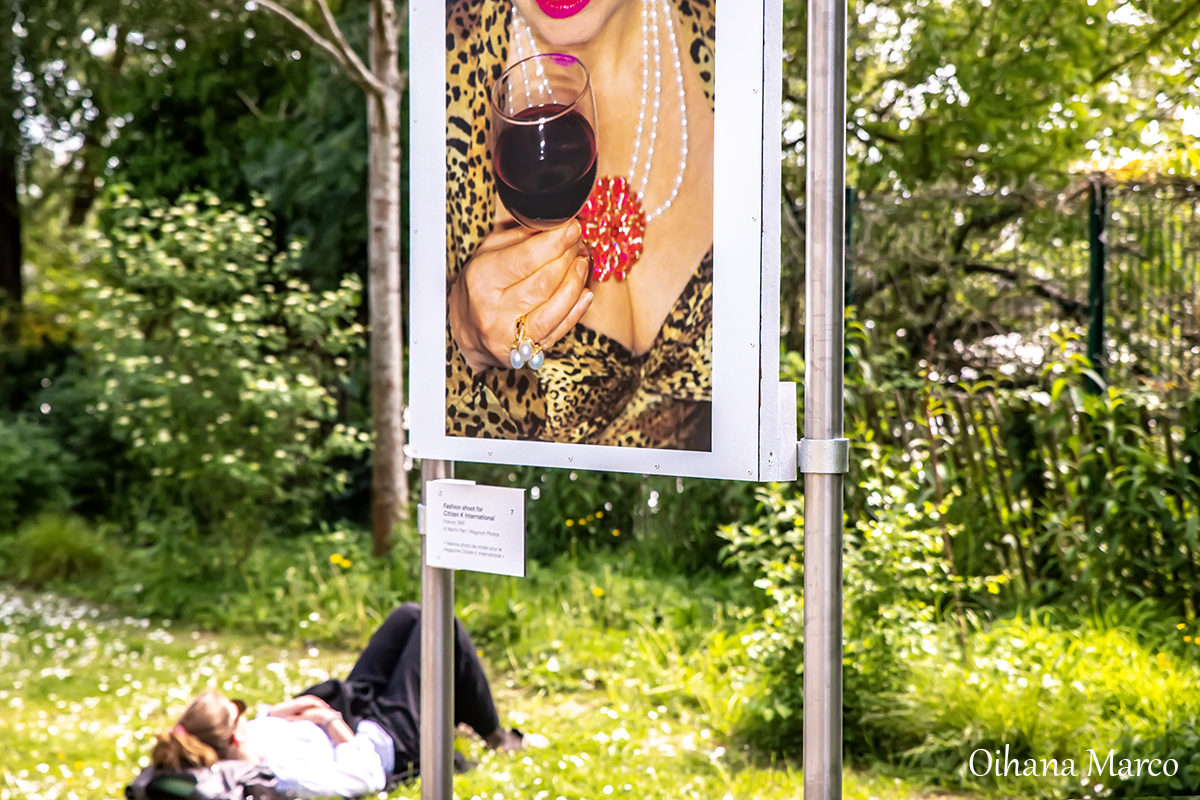 - Sous une photographie très colorée, un visiteur s’allonge dans l’herbe. Sans le vouloir, la scène devient presque une image dans l’image : détente, soleil, décalage et vie ordinaire au pied de l’exposition.
