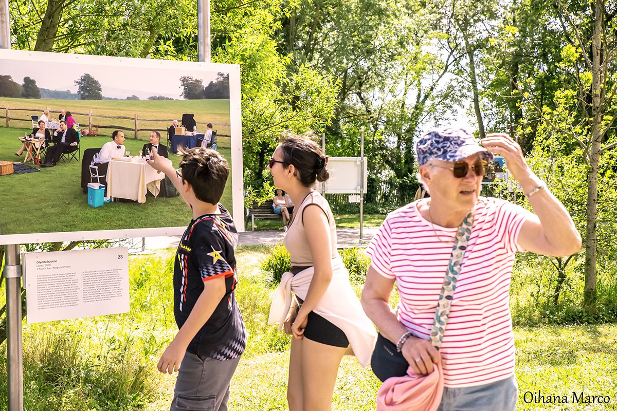 Il y a quelque chose de très juste à découvrir Martin Parr dehors. Pas dans le silence contrôlé d’une salle d’exposition, mais au milieu des arbres, des passants, du soleil, des discussions et des gestes ordinaires. Dans les jardins de la Cité du Vin, ses photographies ne sont pas seulement regardées : elles sont traversées, croisées, parfois presque rejouées par celles et ceux qui passent devant elles.