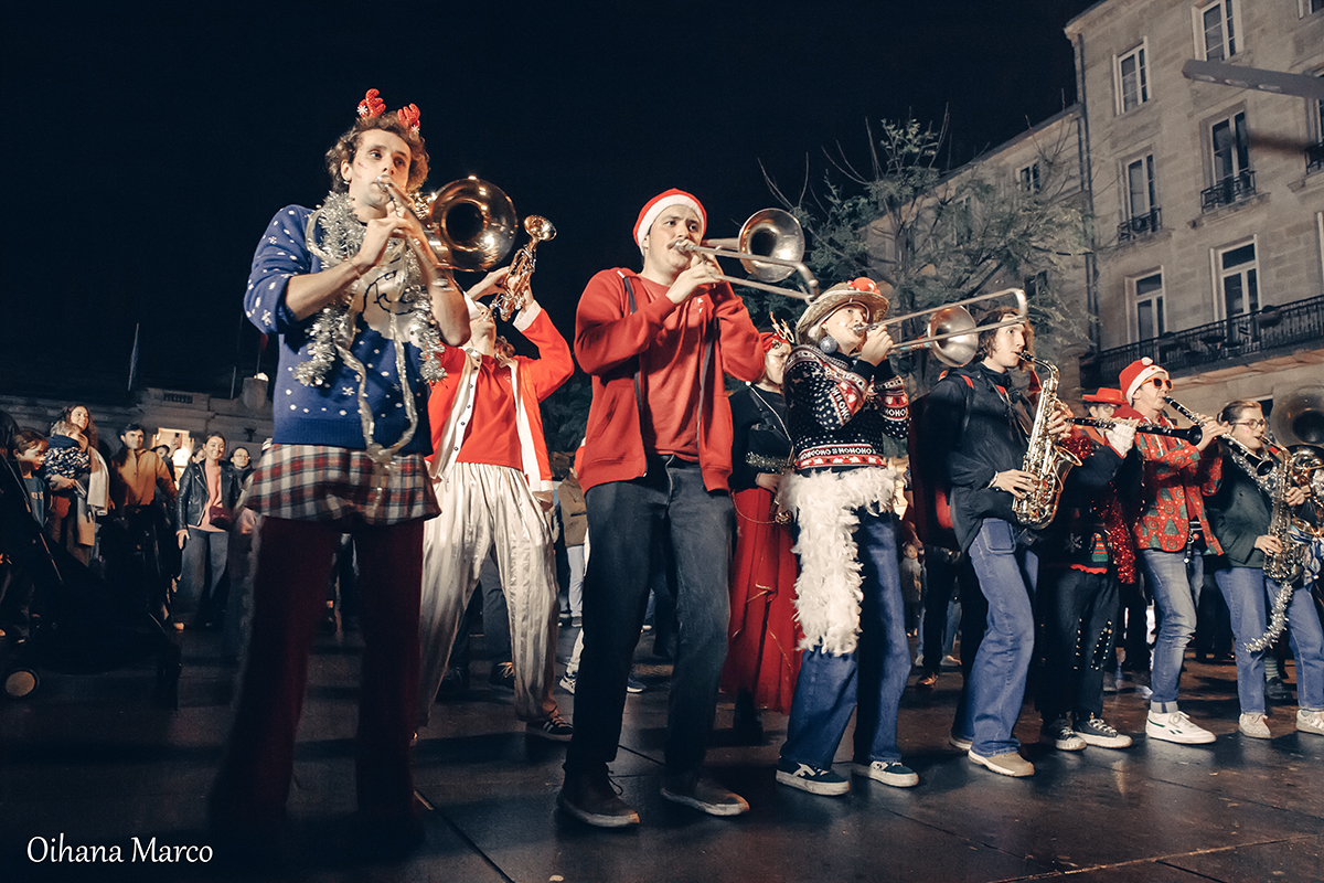 À 18h30, la Banda Los Téoporos a donné le signal du départ d’une déambulation qui a traversé le cours de l’Intendance. Les images montrent un cortège animé, accompagné par les instruments et les rythmes festifs de la fanfare. Cette séquence, très visuelle, a servi de transition entre les deux temps forts de la soirée, reliant naturellement la place de la Comédie à la place Pey-Berland.