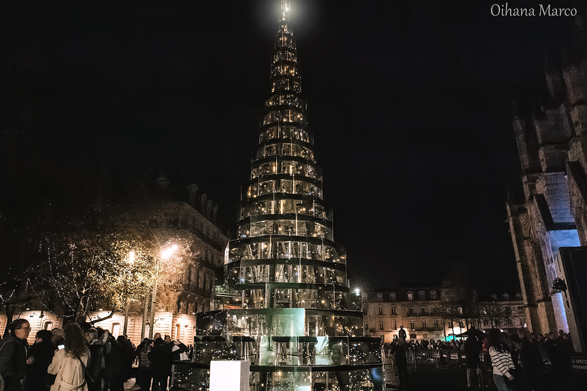 À 19 heures, le “Sapin Verre” d’Arnaud Lapierre a été illuminé pour la quatrième année consécutive. Conçue en verre et acier recyclés et réalisée en partenariat avec la Métallerie bordelaise et une entreprise de Latresne, l’œuvre s’anime quotidiennement jusqu’au 4 janvier. Les photos montrent l’affluence autour de la structure, les jeux de reflets et le moment convivial organisé par la Ville, avec boissons chaudes et encas offerts au public.