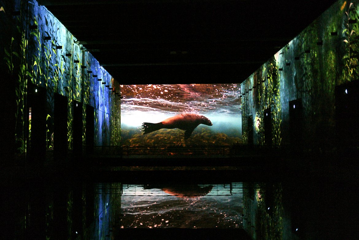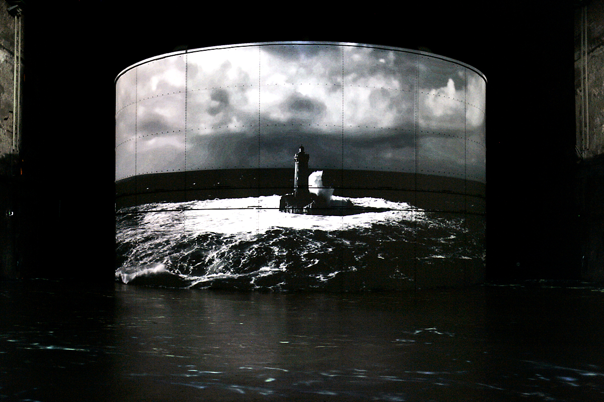 Sous la voûte des anciens bassins de la base sous-marine, les premières images apparaissent dans la pénombre. Les parois monumentales, les reflets de l’eau et l’échelle du lieu confèrent d’emblée une dimension presque cinématographique à l’expérience. On circule entre les passerelles, tandis que les silhouettes des visiteurs se découpent dans les projections mouvantes.